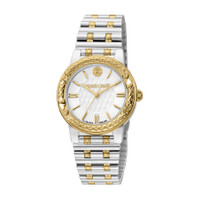 Silver-tone stainless steel case with a two-tone (silver-tone and yellow gold-tone) stainless steel bracelet. Fixed yellow gold-tone stainless steel bezel. Silver-tone dial with yellow gold-tone hands and index hour markers. Dial Type: Analog. Quartz movement. Scratch resistant sapphire crystal. Round case shape, case size: 32 mm. Fold over clasp with a safety release. Water resistant at 50 meters / 165 feet. Functions: hour, minute, second. Fashion Watch Series. Fashion watch style. Watch label: Swiss Made. Roberto Cavalli Fashion Watch Quartz Silver Dial Ladies Watch RV1L188M0081. INFORMATION Brand: Roberto Cavalli Series: Fashion Watch Collection Name: Fashion Watch Gender: Womens Model: RV1L188M0081 Watch Label: Swiss Made Movement: Quartz CASE Case Size: 32 mm Case Material: Stainless Steel Case Shape: Round BAND Band Material: Stainless Steel Band Type: Bracelet Band Color: Two-tone (Silver-tone and Yellow Gold-tone) Clasp: Fold Over with Safety Release DIAL Dial Color: Silver-tone Type: Analog Crystal: Scratch Resistant Sapphire Hands: Yellow Gold-tone Dial Markers: Index Bezel: Fixed Bezel Color: Yellow Gold-tone Bezel Material: Stainless Steel FEATURES Water Resistance: 50 meters / 165 feet Functions: Hour, Minute, Second Watch Features: Stainless Steel, Gold, Analog ADDITIONAL INFO Watch Style: Fashion Warranty: With Manufacturers Guarantee UPC Code: 4894626188114 Jomashop Sku: Y-A4GJB Department: Watches