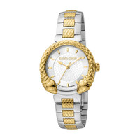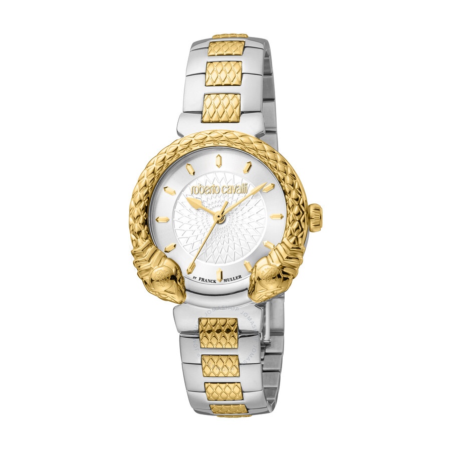 Yellow gold-tone stainless steel case with a two-tone (silver-tone and yellow gold-tone) stainless steel bracelet. Fixed yellow gold-tone stainless steel bezel. Silver-tone dial with yellow gold-tone hands and index hour markers. Dial Type: Analog. Quartz movement. Scratch resistant sapphire crystal. Round case shape, case size: 32 mm. Fold over clasp with a safety release. Water resistant at 50 meters / 165 feet. Functions: hour, minute, second. Fashion Watch Series. Fashion watch style. Watch label: Swiss Made. Roberto Cavalli Fashion Watch Quartz Silver Dial Ladies Watch RV1L190M0061. INFORMATION Brand: Roberto Cavalli Series: Fashion Watch Collection Name: Fashion Watch Gender: Womens Model: RV1L190M0061 Watch Label: Swiss Made Movement: Quartz CASE Case Size: 32 mm Case Material: Stainless Steel Case Shape: Round BAND Band Material: Stainless Steel Band Type: Bracelet Band Color: Two-tone (Silver-tone and Yellow Gold-tone) Clasp: Fold Over with Safety Release DIAL Dial Color: Silver-tone Type: Analog Crystal: Scratch Resistant Sapphire Hands: Yellow Gold-tone Dial Markers: Index Bezel: Fixed Bezel Color: Yellow Gold-tone Bezel Material: Stainless Steel FEATURES Water Resistance: 50 meters / 165 feet Functions: Hour, Minute, Second Watch Features: Stainless Steel, Gold, Analog ADDITIONAL INFO Watch Style: Fashion Warranty: With Manufacturers Guarantee UPC Code: 4894626179556 Jomashop Sku: Y-A4GED Department: Watches