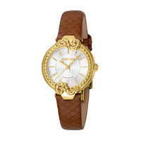 Yellow gold-tone stainless steel case with a brown leather strap. Fixed yellow gold-tone stainless steel bezel. Silver-tone dial with yellow gold-tone hands and index hour markers. Dial Type: Analog. Quartz movement. Scratch resistant sapphire crystal. Round case shape, case size: 30 mm. Water resistant at 50 meters / 165 feet. Functions: hour, minute, second. Fashion Watch Series. Fashion watch style. Watch label: Swiss Made. Roberto Cavalli Fashion Watch Quartz Silver Dial Ladies Watch RV1L214L0021. INFORMATION Brand: Roberto Cavalli Series: Fashion Watch Collection Name: Fashion Watch Gender: Womens Model: RV1L214L0021 Watch Label: Swiss Made Movement: Quartz CASE Case Size: 30 mm Case Material: Stainless Steel Case Shape: Round BAND Band Material: Leather Band Type: Strap Band Color: Brown DIAL Dial Color: Silver-tone Type: Analog Crystal: Scratch Resistant Sapphire Hands: Yellow Gold-tone Dial Markers: Index Bezel: Fixed Bezel Color: Yellow Gold-tone Bezel Material: Stainless Steel FEATURES Water Resistance: 50 meters / 165 feet Functions: Hour, Minute, Second Watch Features: Stainless Steel, Leather, Gold, Analog ADDITIONAL INFO Watch Style: Fashion Warranty: With Manufacturers Guarantee UPC Code: 4894626220296 Jomashop Sku: Y-A4GF9 Department: Watches