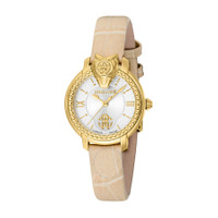 Yellow gold-tone stainless steel case with a beige leather strap. Fixed yellow gold-tone stainless steel bezel. Silver-tone dial with yellow gold-tone hands and index hour markers. Dial Type: Analog. Quartz movement. Scratch resistant sapphire crystal. Round case shape, case size: 30 mm. Water resistant at 50 meters / 165 feet. Functions: hour, minute, second. Fashion Watch Series. Fashion watch style. Watch label: Swiss Made. Roberto Cavalli Fashion Watch Quartz Silver Dial Ladies Watch RV1L215L0021. INFORMATION Brand: Roberto Cavalli Series: Fashion Watch Collection Name: Fashion Watch Gender: Womens Model: RV1L215L0021 Watch Label: Swiss Made Movement: Quartz CASE Case Size: 30 mm Case Material: Stainless Steel Case Shape: Round BAND Band Material: Leather Band Type: Strap Band Color: Beige DIAL Dial Color: Silver-tone Type: Analog Crystal: Scratch Resistant Sapphire Hands: Yellow Gold-tone Dial Markers: Index Bezel: Fixed Bezel Color: Yellow Gold-tone Bezel Material: Stainless Steel FEATURES Water Resistance: 50 meters / 165 feet Functions: Hour, Minute, Second Watch Features: Stainless Steel, Leather, Gold, Analog ADDITIONAL INFO Watch Style: Fashion Warranty: With Manufacturers Guarantee UPC Code: 4894626220364 Jomashop Sku: Y-A4GD2 Department: Watches