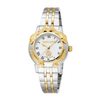 Silver-tone stainless steel case with a two-tone (silver-tone and yellow gold-tone) stainless steel bracelet. Fixed yellow gold-tone stainless steel bezel. Silver-tone dial with yellow gold-tone hands and Roman numeral hour markers. Dial Type: Analog. Quartz movement. Scratch resistant sapphire crystal. Round case shape, case size: 32 mm. Fold over clasp with a safety release. Water resistant at 50 meters / 165 feet. Functions: hour, minute, second. Fashion Watch Series. Fashion watch style. Watch label: Swiss Made. Roberto Cavalli Fashion Watch Quartz Silver Dial Ladies Watch RV1L227M0081. INFORMATION Brand: Roberto Cavalli Series: Fashion Watch Collection Name: Fashion Watch Gender: Womens Model: RV1L227M0081 Watch Label: Swiss Made Movement: Quartz CASE Case Size: 32 mm Case Material: Stainless Steel Case Shape: Round BAND Band Material: Stainless Steel Band Type: Bracelet Band Color: Two-tone (Silver-tone and Yellow Gold-tone) Clasp: Fold Over with Safety Release DIAL Dial Color: Silver-tone Type: Analog Crystal: Scratch Resistant Sapphire Hands: Yellow Gold-tone Dial Markers: Roman Numeral Bezel: Fixed Bezel Color: Yellow Gold-tone Bezel Material: Stainless Steel FEATURES Water Resistance: 50 meters / 165 feet Functions: Hour, Minute, Second Watch Features: Stainless Steel, Gold, Analog ADDITIONAL INFO Watch Style: Fashion Warranty: With Manufacturers Guarantee UPC Code: 4894626232862 Jomashop Sku: Y-A4GKQ Department: Watches