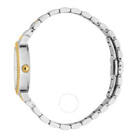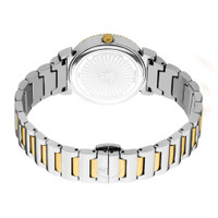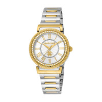 Silver-tone stainless steel case with a two-tone (silver-tone and yellow gold-tone) stainless steel bracelet. Fixed yellow gold-tone stainless steel bezel. Silver-tone dial with yellow gold-tone hands and Roman numeral hour markers. Minute scale around the inner rim. Dial Type: Analog. Quartz movement. Scratch resistant mineral crystal. Pull / push crown. Solid case back. Round case shape, case size: 32 mm. Fold over clasp with a safety release. Water resistant at 50 meters / 165 feet. Functions: hour, minute, second. Glam Series. Fashion watch style. Roberto Cavalli Glam Silver-tone Dial Ladies Watch RC5L039M1085. GENERAL Box Type: Original Box Brand Type: Designer CASE Case Material: Stainless Steel Case Shape: Round Case Back: Solid BAND Band Material: Stainless Steel Band Type: Bracelet Band Color: Two-tone (Silver-tone and Yellow Gold-tone) Clasp: Fold Over with Safety Release DIAL Dial Color: Silver-tone Type: Analog Crystal: Scratch Resistant Mineral Hands: Yellow Gold-tone Dial Markers: Roman Numeral Second Markers: Minute Scale around the inner rim Bezel: Fixed Bezel Color: Yellow Gold-tone Bezel Material: Stainless Steel Crown: Pull / Push INFORMATION Brand: Roberto Cavalli Series: Glam Collection Name: Glam Gender: Womens Model: RC5L039M1085 Movement: Quartz FEATURES Water Resistance: 50 meters / 165 feet Functions: Hour, Minute, Second Watch Features: Analog, Gold, Stainless Steel ADDITIONAL INFO Watch Style: Fashion Warranty: With Manufacturers Guarantee UPC Code: 4894626236709 Jomashop Sku: Y-A5DM5 Department: Watches