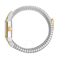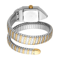 Yellow gold-tone stainless steel case with a two-tone (silver-tone and yellow gold-tone) stainless steel bracelet. Fixed yellow gold-tone stainless steel bezel. Silver-tone dial with yellow gold-tone hands and index hour markers. Dial Type: Analog. Quartz movement. Scratch resistant mineral crystal. Pull / push crown. Solid case back. Rectangle case shape, case size: 19.5 mm. Water resistant at 30 meters / 100 feet. Functions: hour, minute. Snake Core Series. Fashion watch style. Roberto Cavalli Snake Core Silver-tone Dial Ladies Watch RC5L076M0055. GENERAL Box Type: Original Box Brand Type: Designer CASE Case Material: Stainless Steel Case Shape: Rectangle Case Back: Solid BAND Band Material: Stainless Steel Band Type: Bracelet Band Color: Two-tone (Silver-tone and Yellow Gold-tone) DIAL Dial Color: Silver-tone Type: Analog Crystal: Scratch Resistant Mineral Hands: Yellow Gold-tone Dial Markers: Index Bezel: Fixed Bezel Color: Yellow Gold-tone Bezel Material: Stainless Steel Crown: Pull / Push INFORMATION Brand: Roberto Cavalli Series: Snake Core Collection Name: Snake Core Gender: Womens Model: RC5L076M0055 Movement: Quartz FEATURES Water Resistance: 30 meters / 100 feet Functions: Hour, Minute Watch Features: Analog, Gold, Stainless Steel ADDITIONAL INFO Watch Style: Fashion Warranty: With Manufacturers Guarantee UPC Code: 4894626248849 Jomashop Sku: Y-A5DLM Department: Watches
