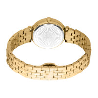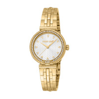 Yellow gold-tone stainless steel case and bracelet. Fixed yellow gold-tone stainless steel bezel. Silver-tone dial with yellow gold-tone hands and index hour markers. Dial Type: Analog. Quartz movement. Scratch resistant mineral crystal. Pull / push crown. Solid case back. Round case shape, case size: 30 mm. Fold over clasp with a safety release. Water resistant at 50 meters / 165 feet. Functions: hour, minute, second. Snake Core Series. Fashion watch style. Roberto Cavalli Snake Core Silver-tone Dial Ladies Watch RC5L078M0025. GENERAL Box Type: Original Box Brand Type: Designer CASE Case Material: Stainless Steel Case Shape: Round Case Back: Solid BAND Band Material: Stainless Steel Band Type: Bracelet Band Color: Yellow Gold-tone Clasp: Fold Over with Safety Release DIAL Dial Color: Silver-tone Type: Analog Crystal: Scratch Resistant Mineral Hands: Yellow Gold-tone Dial Markers: Index Bezel: Fixed Bezel Color: Yellow Gold-tone Bezel Material: Stainless Steel Crown: Pull / Push INFORMATION Brand: Roberto Cavalli Series: Snake Core Collection Name: Snake Core Gender: Womens Model: RC5L078M0025 Movement: Quartz FEATURES Water Resistance: 50 meters / 165 feet Functions: Hour, Minute, Second Watch Features: Analog, Gold, Stainless Steel ADDITIONAL INFO Watch Style: Fashion Warranty: With Manufacturers Guarantee UPC Code: 4894626236402 Jomashop Sku: Y-A5DKU Department: Watches