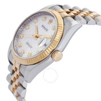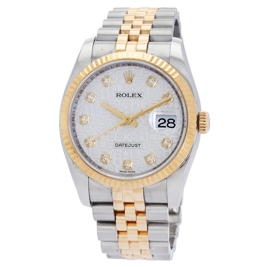 Silver-tone stainless steel case with a two-tone (silver-tone and gold-tone) stainless steel and 18kt yellow gold rolex jubilee bracelet. Fixed fluted 18kt yellow gold bezel. Silver dial with yellow gold-tone hands and diamond hour markers. Dial Type: Analog. Date display at the 3 o'clock position. Rolex Calibre 3135 Automatic movement, containing 31 Jewels, bitting at 28800 vph, and has a power reserve of approximately 48 hours. Scratch resistant sapphire crystal. Screw down crown. Solid case back. Round case shape, case size: 36 mm. Band length: 6 3/4 inches. Deployment clasp. Water resistant at 100 meters / 330 feet. Functions: date, hour, minute, second, chronometer. Additional Info: date displays at 3 o'clock position. Oyster Perpetual Series. Luxury watch style. Watch label: Swiss Made. Pre-owned Rolex Oyster Perpetual Datejust 36 Silver With 10 Diamonds Dial Stainless Steel and 18K Yellow Gold Jubilee Bracelet Automatic Men's Watch 11. GENERAL Collection Name: Oyster Perpetual INFORMATION Brand: Rolex Series: Oyster Perpetual Model: 116233-SJDJ Gender: Mens Watch Label: Swiss Made Movement: Automatic Engine: Rolex Calibre 3135 Power Reserve: 50 hours CONDITION INFORMATION Box: No Papers: No Comments: Fits wrist size 6.75 inches CASE Case Size: 36 Case Material: Stainless Steel Case Shape: Round Case Back: Solid DIAL Type: Analog Dial Color: Ivory Crystal: Scratch Resistant Sapphire Hands: Yellow Gold-tone Dial Markers: Diamond Bezel: Fixed Fluted Bezel Color: Gold-tone Bezel Material: 18kt Yellow Gold Crown: Screw Down BAND Band Type: Bracelet Band Material: Stainless Steel and 18kt Yellow Gold Rolex Jubilee Band Color: Two-tone (Silver-tone and Gold-tone) Band Length: 6 3/4 inches Clasp: Deployment FEATURES Water Resistance: 100 meters / 330 feet Calendar: Date display at the 3 o'clock position Functions: Date, Hour, Minute, Second, Chronometer Watch Features: Analog, Chronometer, Perpetual, Gold, Stainless Steel, Diamond ADDITIONAL INFO Watch Style: Luxury Warranty: 1 Year Jomashop Warranty Additional Info: Date Displays At 3 O'clock Position Jomashop Sku: PRE-RLX116233IJDJ Department: Watches Category: Watches