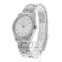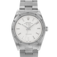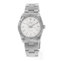 Silver-tone stainless steel case with a silver-tone stainless steel oyster bracelet. Engine-turned silver-tone stainless steel bezel. Silver-tone dial with silver-tone hands and index hour markers. Minute markers around the outer rim. Dial Type: Analog. Rolex Calibre 3000 Automatic movement, based upon Rolex 3035, containing 27 Jewels, bitting at 28800 vph, and has a power reserve of approximately 42 hours. Screw down crown. Solid case back. Round case shape, case size: 34 mm. Fold over clasp with a safety release. Functions: hour, minute, second, chronometer. Air King Series. Luxury watch style. Watch label: Swiss Made. Pre-owned Rolex Air King Automatic Chronometer Silver Dial Men's Watch 14010 SSO. GENERAL Year: Circa 1999 Comments: This Rolex Air King, reference number 14010, has a manufacturer year of Circa 1999. Box not included, Papers not included . This watch has a 34mm Steel Case with Steel bezel, Silver Index numerals dial and Steel bracelet with Fold clasp. The Automatic movement has Time Only function. The wrist measures 7.25 inches or 18.415 centimeters. The condition is Very Good The watch listed is in stock and the pictures shown are of the actual watch for sale. All of our watches have been thoroughly checked Preowned Item Condition: Very Good CASE Case Material: Stainless Steel Case Shape: Round Case Back: Solid BAND Band Material: Stainless Steel Oyster Band Type: Bracelet Band Color: Silver-tone Clasp: Fold Over with Safety Release DIAL Dial Color: Silver-tone Type: Analog Hands: Silver-tone Dial Markers: Index Second Markers: Minute Markers around the outer rim Bezel: Engine-Turned Bezel Color: Silver-tone Bezel Material: Stainless Steel Crown: Screw Down INFORMATION Brand: Rolex Series: Air King Collection Name: Air King Gender: Mens Model: 14010 SSO Watch Label: Swiss Made Movement: Automatic Engine: Rolex Calibre 3000 Power Reserve: 42 hours FEATURES Functions: Hour, Minute, Second, Chronometer Watch Features: Analog, Chronometer, Stainless Steel ADDITIONAL INFO Watch Style: Luxury Warranty: 1 Year Jomashop Warranty Jomashop Sku: PRE-P-RLX104316 Department: Watches Category: Watches