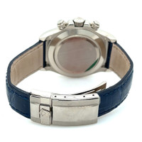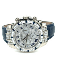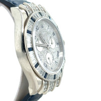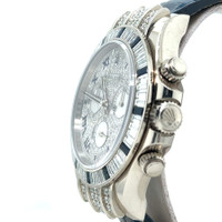 18kt white gold case with a blue leather strap. Fixed with 48 baguette diamonds and 12 sapphires compass compass 18kt white gold bezel. Diamond dial with silver-tone hands and Roman numeral hour markers. Dial Type: Analog. Luminescent hands. Chronograph - three sub-dials displaying: 60 second, 30 minute and 12 hour. Rolex Calibre 4130 Automatic movement, based upon Rolex 4030, containing 44 Jewels, bitting at 28800 vph, and has a power reserve of approximately 72 hours. Scratch resistant sapphire crystal. Screw down crown. Solid case back. Round case shape, case size: 40 mm, case thickness: 12 mm. Band width: 20 mm. Fold over clasp. Water resistant at 100 meters / 330 feet. Functions: chronograph, hour, minute, second. Cosmograph Daytona Series. Luxury watch style. Watch label: Swiss Made. Pre-owned Rolex Cosmograph Daytona Chronograph Automatic Men's Watch 116599-12SA. GENERAL Collection Name: Cosmograph Daytona INFORMATION Brand: Rolex Series: Cosmograph Daytona Model: 116599-12SA Gender: Mens Watch Label: Swiss Made Movement: Automatic Engine: Rolex Calibre 4130 Power Reserve: 72 hours CONDITION INFORMATION Box: Yes Preowned Item Condition: Excellent Papers: Yes CASE Case Size: 40 Case Thickness: 12 mm Case Material: 18kt White Gold Case Shape: Round Case Back: Solid DIAL Type: Analog Dial Color: Diamond Crystal: Scratch Resistant Sapphire Hands: Silver-tone Dial Markers: Roman Numeral Sub Dials: Three - 60 Second, 30 Minute and 12 Hour Luminiscence: Hands Bezel: Fixed with 48 baguette diamonds and 12 sapphires C Bezel Material: 18kt White Gold Crown: Screw Down BAND Band Type: Strap Band Material: Leather Band Color: Blue Band Width: 20 mm Clasp: Fold Over FEATURES Water Resistance: 100 meters / 330 feet Functions: Chronograph, Hour, Minute, Second Watch Features: Analog, Gold, Leather, Compass, Chronograph, Diamond ADDITIONAL INFO Watch Style: Luxury Warranty: 1 Year Jomashop Warranty Jomashop Sku: PRE-P-RLX72897 Department: Watches Category: Watches