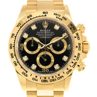 Pre-owned 18kt yellow gold case with a 18kt yellow gold oyster bracelet. Fixed 18kt yellow gold bezel. Black and gold dial with yellow gold hands and diamonds hour markers. Tachymeter. Dial Type: Analog. Luminescent hands. Chronograph - three sub-dials displaying: 60 second, 30 minute and 12 hours. Rolex Calibre 4130 automatic movement with a 72-hour power reserve. Scratch resistant sapphire crystal. Screw down crown. Solid case back. Round case shape, case size: 40 mm. Folding oysterlock clasp. Water resistant at 100 meters / 330 feet. Functions: chronograph, hour, minute, second. Cosmograph Daytona Series. Luxury watch style. Watch label: Swiss Made. Rolex Cosmograph Daytona Chronograph Automatic Diamond Men's Watch 116508BKGDDO. GENERAL Preowned Item Condition: Excellent CASE Case Material: 18kt Yellow Gold Case Shape: Round Case Back: Solid BAND Band Material: 18kt Yellow Gold Oyster Band Type: Bracelet Band Color: Yellow Gold-tone Clasp: Folding Oysterlock DIAL Dial Color: Black and Gold Type: Analog Crystal: Scratch Resistant Sapphire Hands: Yellow Gold Dial Markers: Diamonds Second Markers: Tachymeter Sub Dials: Three - 60 Second, 30 Minute and 12 Hours Luminiscence: Hands Bezel: Fixed Bezel Color: Yellow Gold-tone Bezel Material: 18kt Yellow Gold Crown: Screw Down INFORMATION Brand: Rolex Series: Cosmograph Daytona Collection Name: Cosmograph Daytona Gender: Mens Model: 116508BKGDDO Watch Label: Swiss Made Movement: Automatic Engine: Rolex Calibre 4130 Power Reserve: 72 hours FEATURES Water Resistance: 100 meters / 330 feet Functions: Chronograph, Hour, Minute, Second Watch Features: Analog, Gold, Chronograph, Diamond ADDITIONAL INFO Watch Style: Luxury Warranty: 1 Year Jomashop Warranty Jomashop Sku: PRE-P-RLX101559 Department: Watches Category: Watches
