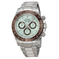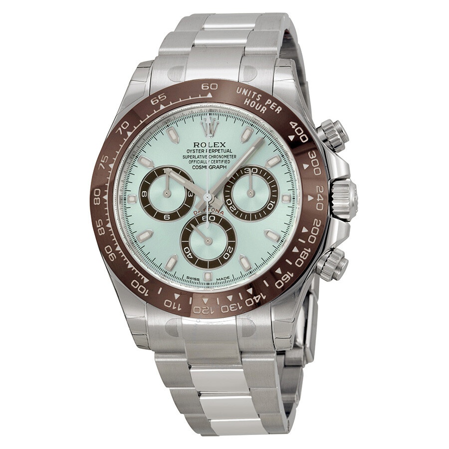 Pre-owned Platinum case with a platinum Rolex oyster bracelet. Fixed chestnut brown monobloc cerachrom bezel. Ice blue dial with luminous silver-tone hands and index hour markers. Minute markers around the outer rim. Dial Type: Analog. Luminescent hands and markers. Chronograph - three sub-dials displaying: 60 second, 30 minute and 12 hour. Rolex calibre 4130 automatic movement with a 72-hour power reserve. Scratch resistant sapphire crystal. Screw down crown. Solid case back. Case size: 40 mm. Round case shape. Oysterlock clasp. Water resistant at 100 meters / 330 feet. Functions: chronograph, hour, minute, second, chronometer. Luxury watch style. Watch label: Swiss Made. Rolex Cosmograph Daytona Ice Blue Dial Platinum Rolex Oyster Automatic Men's Watch 116506IBLSO. GENERAL Collection Name: Cosmograph Daytona INFORMATION Brand: Rolex Series: Cosmograph Daytona Model: 116506IBLSO Gender: Mens Watch Label: Swiss Made Movement: Automatic Engine: Rolex Calibre 4130 Power Reserve: 72 hours CONDITION INFORMATION Box: Yes Preowned Item Condition: Very Good Papers: Yes CASE Case Diameter: 40 Case Material: Platinum Case Shape: Round Case Back: Solid DIAL Type: Analog Dial Color: Ice Blue Crystal: Scratch Resistant Sapphire Hands: Luminous Silver-tone Second Markers: Minute Markers around the outer rim Dial Markers: Index Sub Dials: Three - 60 Second, 30 Minute and 12 Hour Luminiscence: Hands and Markers Bezel: Fixed Tachymeter Scale Bezel Color: Chestnut Brown Monobloc Bezel Material: Cerachrom Crown: Screw Down BAND Band Type: Bracelet Band Material: Platinum Rolex Oyster Band Color: Silver-tone Clasp: Oysterlock FEATURES Water Resistance: 100 meters / 330 feet Functions: Chronograph, Hour, Minute, Second, Chronometer Watch Features: Chronograph, Analog, Chronometer, Platinum ADDITIONAL INFO Watch Style: Luxury Warranty: 1 Year Jomashop Warranty UPC Code: 845960057639 Jomashop Sku: PRE-P-RLX97902 Department: Watches