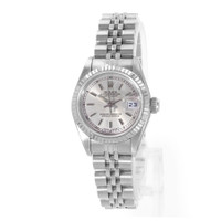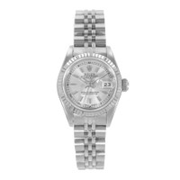 Silver-tone stainless steel case with a silver-tone stainless steel jubilee bracelet. Fixed 18kt white gold bezel. Silver-tone dial with silver-tone hands and index hour markers. Minute markers around the outer rim. Dial Type: Analog. Luminescent hands. Date display at the 3 o'clock position. Rolex Calibre 2135 Automatic movement, containing 29 Jewels, bitting at 28800 vph, and has a power reserve of approximately 42 hours. Screw down crown. Solid case back. Round case shape, case size: 26 mm. Fold over clasp with a safety release. Functions: date, hour, minute, second, chronometer. Datejust 26 Series. Luxury watch style. Watch label: Swiss Made. Pre-owned Rolex Datejust 26 Automatic Chronometer Silver Dial Ladies Watch 69174 SSJ. GENERAL Year: Circa 1995 Comments: This Rolex Datejust 26, reference number 69174, has a manufacturer year of Circa 1995. Box not included, Papers Included . This watch has a 26mm Steel Case with White gold bezel, Silver Index numerals dial and Steel bracelet with Fold clasp. The Automatic movement has Date function. The wrist measures 6.5 inches or 16.51 centimeters. The condition is Very Good The watch listed is in stock and the pictures shown are of the actual watch for sale. All of our watches have been thoroughly checked by Preowned Item Condition: Very Good CASE Case Material: Stainless Steel Case Shape: Round Case Back: Solid BAND Band Material: Stainless Steel Jubilee Band Type: Bracelet Band Color: Silver-tone Clasp: Fold Over with Safety Release DIAL Dial Color: Silver-tone Type: Analog Hands: Silver-tone Dial Markers: Index Second Markers: Minute Markers around the outer rim Luminiscence: Hands Bezel: Fixed Bezel Material: 18kt White Gold Crown: Screw Down INFORMATION Brand: Rolex Series: Datejust Collection Name: Datejust 26 Gender: Womens Model: 69174 SSJ Watch Label: Swiss Made Movement: Automatic Engine: Rolex Calibre 2135 Power Reserve: 42 hours FEATURES Calendar: Date display at the 3 o'clock position Functions: Date, Hour, Minute, Second, Chronometer Watch Features: Analog, Chronometer, Gold, Stainless Steel ADDITIONAL INFO Watch Style: Luxury Warranty: 1 Year Jomashop Warranty Jomashop Sku: PRE-P-RLX104145 Department: Watches Category: Watches