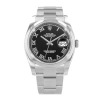 Silver-tone stainless steel case with a silver-tone stainless steel oyster bracelet. Fixed silver-tone stainless steel bezel. Black dial with silver-tone hands and Roman numeral hour markers. Minute markers around the outer rim. Dial Type: Analog. Date display at the 3 o'clock position. Rolex Calibre 3135 Automatic movement, containing 31 Jewels, bitting at 28800 vph, and has a power reserve of approximately 48 hours. Scratch resistant sapphire crystal. Screw down crown. Solid case back. Round case shape, case size: 36 mm. Fold over clasp with a safety release. Water resistant at 100 meters / 330 feet. Functions: date, hour, minute, second, chronometer. Datejust 36 Series. Luxury watch style. Watch label: Swiss Made. Item Variations: 116200-72600. Pre-owned Rolex Datejust 36 Automatic Chronometer Black Dial Men's Watch 116200 BKRO. GENERAL Year: Circa 2010 Comments: This Rolex Datejust 36, reference number 116200, has a manufacturer year of Circa 2010. Box not included, Papers not included . This watch has a 36mm Steel Case with Steel bezel, Black Roman numerals dial and Steel bracelet with Fold clasp. The Automatic movement has Date function. The wrist measures 6.25 inches or 15.875 centimeters. The condition is Very Good The watch listed is in stock and the pictures shown are of the actual watch for sale. All of our watches have been thoroughly checked b Preowned Item Condition: Very Good CASE Case Material: Stainless Steel Case Shape: Round Case Back: Solid BAND Band Material: Stainless Steel Oyster Band Type: Bracelet Band Color: Silver-tone Clasp: Fold Over with Safety Release DIAL Dial Color: Black Type: Analog Crystal: Scratch Resistant Sapphire Hands: Silver-tone Dial Markers: Roman Numeral Second Markers: Minute Markers around the outer rim Bezel: Fixed Bezel Color: Silver-tone Bezel Material: Stainless Steel Crown: Screw Down INFORMATION Brand: Rolex Series: Datejust Collection Name: Datejust 36 Gender: Mens Model: 116200 BKRO Watch Label: Swiss Made Movement: Automatic Engine: Rolex Calibre 3135 Power Reserve: 48 hours FEATURES Water Resistance: 100 meters / 330 feet Calendar: Date display at the 3 o'clock position Functions: Date, Hour, Minute, Second, Chronometer Watch Features: Stainless Steel, Analog, Chronometer ADDITIONAL INFO Watch Style: Luxury Warranty: 1 Year Jomashop Warranty Jomashop Sku: PRE-P-RLX103599 Item Variation: 116200-72600 Department: Watches Category: Watches