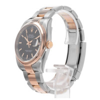 Silver-tone stainless steel case with a two-tone (silver-tone and rose gold-tone) stainless steel and 18kt rose gold oyster bracelet. Fixed rose gold-tone 18kt rose gold bezel. Black dial with rose gold-tone hands and index hour markers. Minute markers around the outer rim. Dial Type: Analog. Luminescent hands and markers. Date display at the 3 o'clock position. Rolex Calibre 3135 Automatic movement, containing 31 Jewels, bitting at 28800 vph, and has a power reserve of approximately 48 hours. Scratch resistant sapphire crystal. Screw down crown. Solid case back. Round case shape, case size: 36 mm. Fold over clasp with a safety release. Water resistant at 100 meters / 330 feet. Functions: date, hour, minute, second, chronometer. Datejust 36 Series. Luxury watch style. Watch label: Swiss Made. Item Variations: 116201, 116201-BKSO, Rolex-116201, Rolex-116201-BKSO 116201, 116201-BKSO, Rolex. Pre-owned Rolex Datejust 36 Automatic Chronometer Black Dial Men's Watch 116201 BKSO. GENERAL Year: Circa 2008 Comments: This Rolex Datejust 36, reference number 116201, has a manufacturer year of Circa 2008. Box not included, Papers not included . This watch has a 36mm Steel & Rose Gold Case with Rose gold bezel, Black Index numerals dial and Steel & Rose Gold bracelet with Fold clasp. The Automatic movement has Date function. The wrist measures 7 inches or 17.78 centimeters. The condition is Very Good The watch listed is in stock and the pictures shown are of the actual watch for sale. All of our watches have b Preowned Item Condition: Very Good CASE Case Material: Stainless Steel Case Shape: Round Case Back: Solid BAND Band Material: Stainless Steel and 18kt Rose Gold Oyster Band Type: Bracelet Band Color: Two-tone (Silver-tone and Rose Gold-tone) Clasp: Fold Over with Safety Release DIAL Dial Color: Black Type: Analog Crystal: Scratch Resistant Sapphire Hands: Rose Gold-tone Dial Markers: Index Second Markers: Minute Markers around the outer rim Luminiscence: Hands and Markers Bezel: Fixed Bezel Color: Rose Gold-tone Bezel Material: 18kt Rose Gold Crown: Screw Down INFORMATION Brand: Rolex Series: Datejust Collection Name: Datejust 36 Gender: Mens Model: 116201 BKSO Watch Label: Swiss Made Movement: Automatic Engine: Rolex Calibre 3135 Power Reserve: 48 hours FEATURES Water Resistance: 100 meters / 330 feet Calendar: Date display at the 3 o'clock position Functions: Date, Hour, Minute, Second, Chronometer Watch Features: Analog, Chronometer, Gold, Stainless Steel ADDITIONAL INFO Watch Style: Luxury Warranty: 1 Year Jomashop Warranty Jomashop Sku: PRE-P-RLX104367 Item Variation: 116201 BKSO Department: Watches Category: Watches