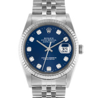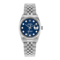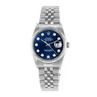 Silver-tone stainless steel case with a silver-tone stainless steel jubilee bracelet. Fixed 18kt white gold bezel. Blue dial with silver-tone hands and diamond hour markers. Minute markers around the outer rim. Dial Type: Analog. Date display at the 3 o'clock position. Rolex Calibre 3135 Automatic movement, containing 31 Jewels, bitting at 28800 vph, and has a power reserve of approximately 48 hours. Scratch resistant sapphire crystal. Screw down crown. Solid case back. Round case shape, case size: 36 mm. Fold over clasp with a safety release. Water resistant at 100 meters / 330 feet. Functions: date, hour, minute, second, chronometer. Datejust 36 Series. Luxury watch style. Watch label: Swiss Made. Pre-owned Rolex Datejust 36 Automatic Chronometer Diamond Blue Dial Men's Watch 16234 BLDJ. GENERAL Year: Circa 2000 Comments: This Rolex Datejust 36, reference number 16234, has a manufacturer year of Circa 2000. Box not included, Papers not included . This watch has a 36mm Steel Case with White gold bezel, Blue Diamond numerals dial and Steel bracelet with Fold clasp. The Automatic movement has Date function. The wrist measures 8 inches or 20.32 centimeters. The condition is Very Good The watch listed is in stock and the pictures shown are of the actual watch for sale. All of our watches have been thoroughly checked Preowned Item Condition: Very Good CASE Case Material: Stainless Steel Case Shape: Round Case Back: Solid BAND Band Material: Stainless Steel Jubilee Band Type: Bracelet Band Color: Silver-tone Clasp: Fold Over with Safety Release DIAL Dial Color: Blue Type: Analog Crystal: Scratch Resistant Sapphire Hands: Silver-tone Dial Markers: Diamond Second Markers: Minute Markers around the outer rim Bezel: Fixed Bezel Material: 18kt White Gold Crown: Screw Down INFORMATION Brand: Rolex Series: Datejust Collection Name: Datejust 36 Gender: Mens Model: 16234 BLDJ Watch Label: Swiss Made Movement: Automatic Engine: Rolex Calibre 3135 Power Reserve: 48 hours FEATURES Water Resistance: 100 meters / 330 feet Calendar: Date display at the 3 o'clock position Functions: Date, Hour, Minute, Second, Chronometer Watch Features: Analog, Chronometer, Gold, Stainless Steel, Diamond ADDITIONAL INFO Watch Style: Luxury Warranty: 1 Year Jomashop Warranty Jomashop Sku: PRE-P-RLX102561 Department: Watches Category: Watches