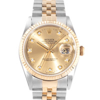 Silver-tone stainless steel case with a two-tone (silver-tone and yellow gold-tone) stainless steel and 18kt yellow gold jubilee bracelet. Fixed yellow gold-tone 18kt yellow gold bezel. Champagne dial with yellow gold-tone hands and diamond hour markers. Minute markers around the outer rim. Dial Type: Analog. Date display at the 3 o'clock position. Rolex Calibre 3135 Automatic movement, containing 31 Jewels, bitting at 28800 vph, and has a power reserve of approximately 48 hours. Scratch resistant sapphire crystal. Screw down crown. Solid case back. Round case shape, case size: 36 mm. Fold over clasp with a safety release. Water resistant at 100 meters / 330 feet. Functions: date, hour, minute, second, chronometer. Datejust 36 Series. Luxury watch style. Watch label: Swiss Made. Pre-owned Rolex Datejust 36 Automatic Chronometer Diamond Champagne Dial Men's Watch 16233 CDJ. GENERAL Year: Circa 1996 Comments: This Rolex Datejust 36, reference number 16233, has a manufacturer year of Circa 1996. Box not included, Papers not included . This watch has a 36mm Steel & Yellow Gold Case with Yellow gold bezel, Champagne Diamond numerals dial and Steel & Yellow Gold bracelet with Fold clasp. The Automatic movement has Date function. The wrist measures 6.75 inches or 17.145 centimeters. The condition is Very Good The watch listed is in stock and the pictures shown are of the actual watch for sale. All of our Preowned Item Condition: Very Good CASE Case Material: Stainless Steel Case Shape: Round Case Back: Solid BAND Band Material: Stainless Steel and 18kt Yellow Gold Jubilee Band Type: Bracelet Band Color: Two-tone (Silver-tone and Yellow Gold-tone) Clasp: Fold Over with Safety Release DIAL Dial Color: Champagne Type: Analog Crystal: Scratch Resistant Sapphire Hands: Yellow Gold-tone Dial Markers: Diamond Second Markers: Minute Markers around the outer rim Bezel: Fixed Bezel Color: Yellow Gold-tone Bezel Material: 18kt Yellow Gold Crown: Screw Down INFORMATION Brand: Rolex Series: Datejust Collection Name: Datejust 36 Gender: Mens Model: 16233 CDJ Watch Label: Swiss Made Movement: Automatic Engine: Rolex Calibre 3135 Power Reserve: 48 hours FEATURES Water Resistance: 100 meters / 330 feet Calendar: Date display at the 3 o'clock position Functions: Date, Hour, Minute, Second, Chronometer Watch Features: Analog, Chronometer, Gold, Stainless Steel, Diamond ADDITIONAL INFO Watch Style: Luxury Warranty: 1 Year Jomashop Warranty Jomashop Sku: PRE-P-RLX103176 Department: Watches Category: Watches