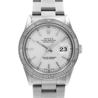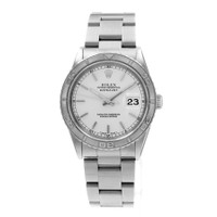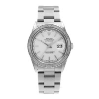 Silver-tone stainless steel case with a silver-tone stainless steel oyster bracelet. Turn-o-graph silver-tone bezel. Silver-tone dial with silver-tone hands and index hour markers. Minute markers around the outer rim. Dial Type: Analog. Luminescent hands and markers. Date display at the 3 o'clock position. Rolex Calibre 3135 Automatic movement, containing 31 Jewels, bitting at 28800 vph, and has a power reserve of approximately 48 hours. Screw down crown. Solid case back. Round case shape, case size: 36 mm. Fold over clasp with a safety release. Functions: date, hour, minute, second, chronometer. Datejust 36 Series. Luxury watch style. Watch label: Swiss Made. Pre-owned Rolex Datejust 36 Automatic Chronometer Silver Dial Men's Watch 16264 SSO. GENERAL Collection Name: Datejust 36 INFORMATION Brand: Rolex Series: Datejust Model: 16264 SSO Gender: Mens Watch Label: Swiss Made Movement: Automatic Engine: Rolex Calibre 3135 Power Reserve: 48 hours CONDITION INFORMATION Box: No Preowned Item Condition: Very Good Papers: Yes Year: 1997 Comments: This Rolex Datejust 36, reference number 16264, has a manufacturer year of 1997. Box not included, Papers Included . This watch has a 36mm Steel Case with Steel bezel, Silver Index numerals dial and Steel bracelet with Buckle. The Automatic movement has Date function. The wrist measures 7.75 inches or 19.685 centimeters. The condition is Very Good The watch listed is in stock and the pictures shown are of the actual watch for sale. All of our watches have been thoroughly checked by our own watc CASE Case Diameter: 36 mm Case Material: Stainless Steel Case Shape: Round Case Back: Solid DIAL Type: Analog Dial Color: Silver-tone Hands: Silver-tone Second Markers: Minute Markers around the outer rim Dial Markers: Index Luminiscence: Hands and Markers Bezel: Turn-O-Graph Bezel Color: Silver-tone Crown: Screw Down BAND Band Type: Bracelet Band Material: Stainless Steel Oyster Band Color: Silver-tone Clasp: Fold Over with Safety Release FEATURES Calendar: Date display at the 3 o'clock position Functions: Date, Hour, Minute, Second, Chronometer Watch Features: Analog, Chronometer, Stainless Steel ADDITIONAL INFO Watch Style: Luxury Warranty: 1 Year Jomashop Warranty Jomashop Sku: PRE-P-RLX99102 Department: Watches