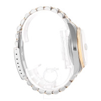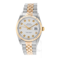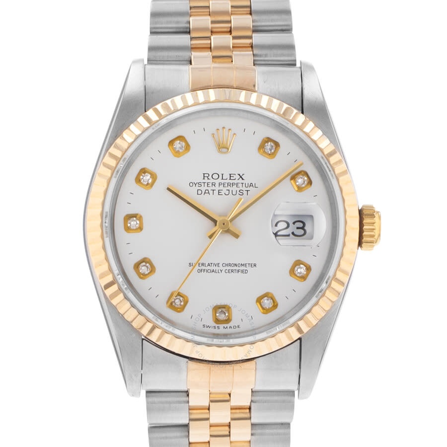 Silver-tone stainless steel case with a two-tone (silver-tone and yellow gold-tone) stainless steel and 18kt yellow gold jubilee bracelet. Fixed yellow gold-tone 18kt yellow gold bezel. White dial with yellow gold-tone hands and diamond hour markers. Minute markers around the outer rim. Dial Type: Analog. Date display at the 3 o'clock position. Rolex Calibre 3135 Automatic movement, containing 31 Jewels, bitting at 28800 vph, and has a power reserve of approximately 48 hours. Scratch resistant sapphire crystal. Screw down crown. Solid case back. Round case shape, case size: 36 mm. Fold over clasp with a safety release. Water resistant at 100 meters / 330 feet. Functions: date, hour, minute, second, chronometer. Datejust Series. Luxury watch style. Watch label: Swiss Made. Pre-owned Rolex Datejust Automatic Chronometer Diamond White Dial Men's Watch 16233 WDJ. GENERAL Collection Name: Datejust INFORMATION Brand: Rolex Series: Datejust Model: 16233 WDJ Gender: Mens Watch Label: Swiss Made Movement: Automatic Engine: Rolex Calibre 3135 Power Reserve: 48 hours CONDITION INFORMATION Box: No Preowned Item Condition: Very Good Papers: No Year: 1993 Comments: This Rolex Datejust, reference number 16233, has a manufacturer year of 1993. Box not included, Papers not included . This watch has a 36mm Steel & Yellow Gold Case with Yellow gold bezel, White Diamond numerals dial and Steel & Yellow Gold bracelet with Buckle. The Automatic movement has Date function. The wrist measures 7.5 inches or 19.05 centimeters. The condition is Very Good The watch listed is in stock and the pictures shown are of the actual watch for sale. All of our watches have been CASE Case Material: Stainless Steel Case Shape: Round Case Back: Solid DIAL Type: Analog Dial Color: White Crystal: Scratch Resistant Sapphire Hands: Yellow Gold-tone Second Markers: Minute Markers around the outer rim Dial Markers: Diamond Bezel: Fixed Bezel Color: Yellow Gold-tone Bezel Material: 18kt Yellow Gold Crown: Screw Down BAND Band Type: Bracelet Band Material: Stainless Steel and 18kt Yellow Gold Jubilee Band Color: Two-tone (Silver-tone and Yellow Gold-tone) Clasp: Fold Over with Safety Release FEATURES Water Resistance: 100 meters / 330 feet Calendar: Date display at the 3 o'clock position Functions: Date, Hour, Minute, Second, Chronometer Watch Features: Analog, Chronometer, Gold, Stainless Steel, Diamond ADDITIONAL INFO Watch Style: Luxury Warranty: 1 Year Jomashop Warranty Jomashop Sku: PRE-P-RLX100218 Department: Watches