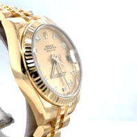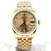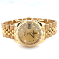 Yellow gold-tone 18kt yellow gold case with a yellow gold-tone 18kt yellow gold jubilee bracelet. Fixed yellow gold-tone 18kt yellow gold bezel. Champagne dial with yellow gold-tone hands and diamond hour markers. Dial Type: Analog. Date display at the 3 o'clock position. Rolex Calibre 2235 Automatic movement, containing 31 Jewels, bitting at 28800 vph, and has a power reserve of approximately 48 hours. Scratch resistant sapphire crystal. Screw down crown. Solid case back. Round case shape, case size: 31 mm, case thickness: 12 mm. Band width: 15.5 mm. Hidden clasp. Water resistant at 100 meters / 330 feet. Functions: date, hour, minute, second. Datejust Series. Luxury watch style. Watch label: Swiss Made. Pre-owned Rolex Datejust Automatic Diamond Champagne Dial Ladies Watch 178278 CDJ. GENERAL Preowned Item Condition: Excellent CASE Case Thickness: 12 mm Case Material: 18kt Yellow Gold Case Shape: Round Case Back: Solid BAND Band Material: 18kt Yellow Gold Jubilee Band Type: Bracelet Band Color: Yellow Gold-tone Band Width: 15.5 mm Clasp: Hidden DIAL Dial Color: Champagne Type: Analog Crystal: Scratch Resistant Sapphire Hands: Yellow Gold-tone Dial Markers: Diamond Bezel: Fixed Bezel Color: Yellow Gold-tone Bezel Material: 18kt Yellow Gold Crown: Screw Down INFORMATION Brand: Rolex Series: Datejust Collection Name: Datejust Gender: Womens Model: 178278 CDJ Watch Label: Swiss Made Movement: Automatic Engine: Rolex Calibre 2235 Power Reserve: 48 hours FEATURES Water Resistance: 100 meters / 330 feet Calendar: Date display at the 3 o'clock position Functions: Date, Hour, Minute, Second Watch Features: Analog, Gold, Diamond ADDITIONAL INFO Watch Style: Luxury Warranty: 1 Year Jomashop Warranty Jomashop Sku: PRE-P-RLX99357 Department: Watches Category: Watches
