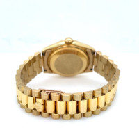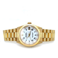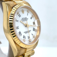 Yellow gold-tone 18kt yellow gold case with a yellow gold-tone 18kt yellow gold president bracelet. Fixed yellow gold-tone 18kt yellow gold bezel. White dial with yellow gold-tone hands and diamond hour markers. Minute markers around the outer rim. Dial Type: Analog. Date display at the 3 o'clock position. Automatic movement. Scratch resistant sapphire crystal. Screw down crown. Solid case back. Round case shape, case size: 31 mm, case thickness: 12 mm. Band width: 14 mm. Crown clasp. Water resistant at 100 meters / 330 feet. Functions: date, hour, minute, second. Datejust Series. Luxury watch style. Watch label: Swiss Made. Pre-owned Rolex Datejust Automatic Diamond White Dial Ladies Watch 68278 WDP. GENERAL Collection Name: Datejust INFORMATION Brand: Rolex Series: Datejust Model: 68278 WDP Gender: Womens Watch Label: Swiss Made Movement: Automatic CONDITION INFORMATION Box: No Preowned Item Condition: Excellent Papers: No CASE Case Size: 31 mm Case Thickness: 12 mm Case Material: 18kt Yellow Gold Case Shape: Round Case Back: Solid DIAL Type: Analog Dial Color: White Crystal: Scratch Resistant Sapphire Hands: Yellow Gold-tone Second Markers: Minute Markers around the outer rim Dial Markers: Diamond Bezel: Fixed Bezel Color: Yellow Gold-tone Bezel Material: 18kt Yellow Gold Crown: Screw Down BAND Band Type: Bracelet Band Material: 18kt Yellow Gold President Band Color: Yellow Gold-tone Band Width: 14 mm Clasp: Crownclasp FEATURES Water Resistance: 100 meters / 330 feet Calendar: Date display at the 3 o'clock position Functions: Date, Hour, Minute, Second Watch Features: Diamond, Gold, Analog ADDITIONAL INFO Watch Style: Luxury Warranty: 1 Year Jomashop Warranty Jomashop Sku: PRE-P-RLX64761 Department: Watches Category: Watches