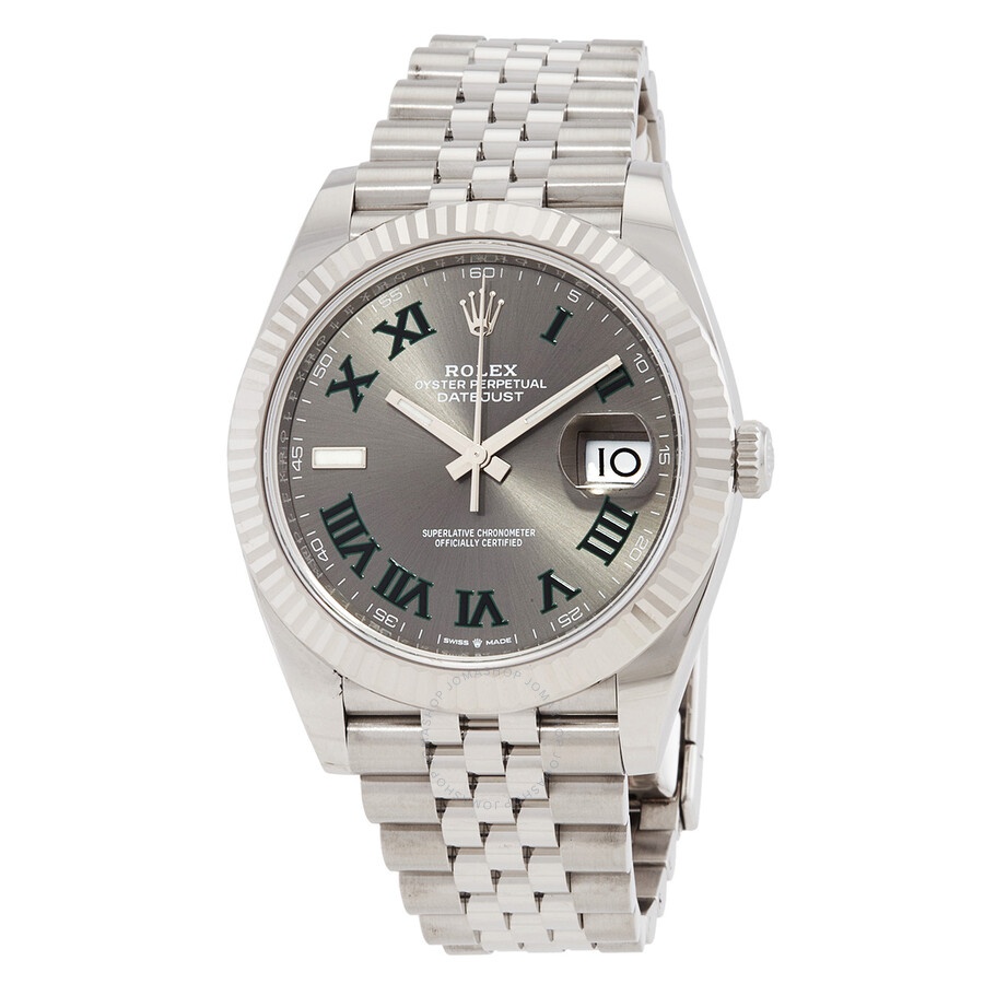 Silver-tone stainless steel case with a silver-tone stainless steel rolex bracelet. Fixed smooth silver-tone stainless steel bezel. Slate dial with luminous silver-tone hands and Roman numeral hour markers. Minute scale around the inner rim. Dial Type: Analog. Luminescent hands and markers. Date display at the 3 o'clock position. Rolex Calibre 3235 Automatic movement, based upon Rolex 3035, containing 31 Jewels, bitting at 28800 vph, and has a power reserve of approximately 70 hours. Scratch resistant sapphire crystal. Screw down crown. Solid case back. Round case shape, case size: 41 mm. Band length: 7 1/2 inches. Fold over clasp with a safety release. Water resistant at 100 meters / 330 feet. Functions: date, hour, minute, second. Datejust Series. Luxury watch style. Watch label: Swiss Made. Pre-owned Rolex Datejust Automatic Men's Watch 126300GYRJ. GENERAL Collection Name: Datejust INFORMATION Brand: Rolex Series: Datejust Model: 126300GYRO Gender: Mens Watch Label: Swiss Made Movement: Automatic Engine: Rolex Calibre 3235 Power Reserve: 70 hours CONDITION INFORMATION Box: Yes Preowned Item Condition: Mint Papers: Yes Year: 2022 Comments: Includes manual CASE Case Size: 41 mm Case Material: Stainless Steel Case Shape: Round Case Back: Solid DIAL Type: Analog Dial Color: Slate Crystal: Scratch Resistant Sapphire Hands: Luminous Silver-tone Second Markers: Minute Scale around the inner rim Dial Markers: Roman Numeral Luminiscence: Hands and Markers Bezel: Fixed Smooth Bezel Color: Silver-tone Bezel Material: Stainless Steel Crown: Screw Down BAND Band Type: Bracelet Band Material: Stainless Steel Rolex Band Color: Silver-tone Band Length: 7 1/2 inches Clasp: Fold Over with Safety Release FEATURES Water Resistance: 100 meters / 330 feet Calendar: Date display at the 3 o'clock position Functions: Date, Hour, Minute, Second Watch Features: Stainless Steel, Analog ADDITIONAL INFO Watch Style: Luxury Warranty: 1 Year Jomashop Warranty Jomashop Sku: PRE-RLX126334GYRJ-1 Department: Watches