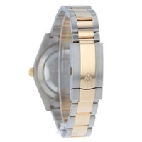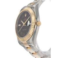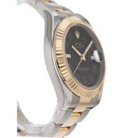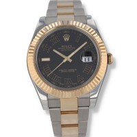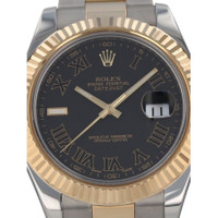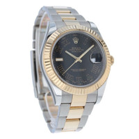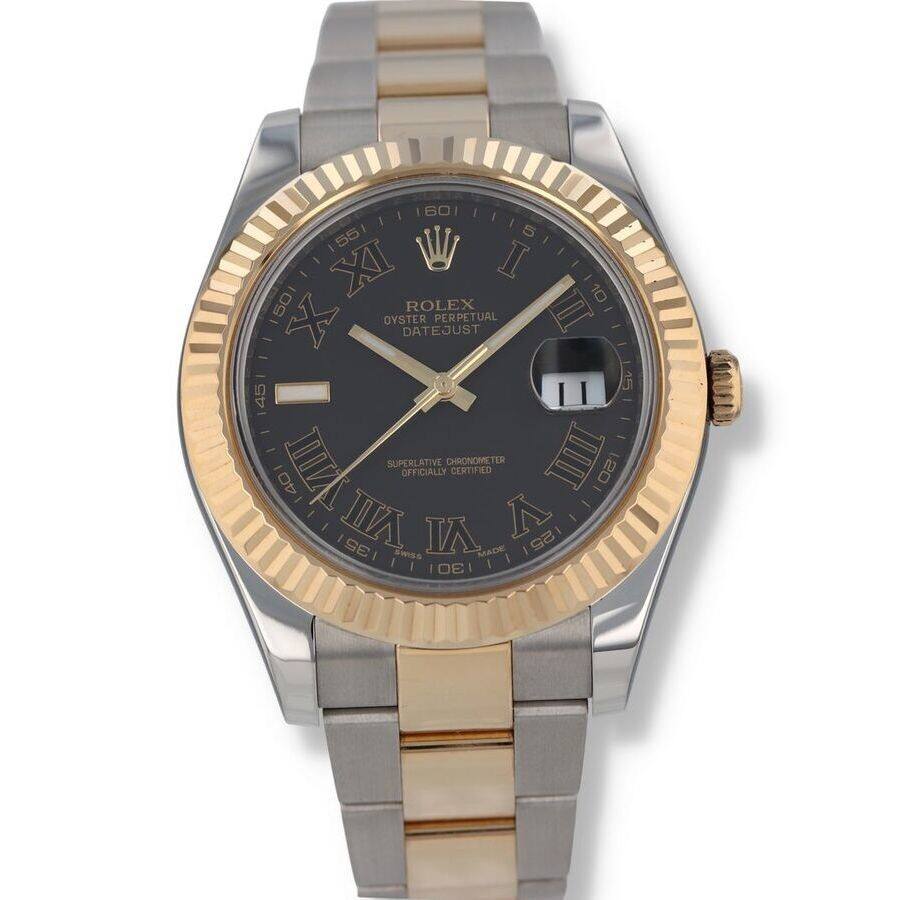Silver-tone stainless steel case with a two-tone (silver-tone and yellow gold-tone) 18kt yellow gold and stainless steel oyster bracelet. Fixed yellow gold-tone 18kt yellow gold bezel. Grey dial with yellow gold-tone hands and Roman numeral hour markers. Minute markers around the outer rim. Dial Type: Analog. Luminescent hands and markers. Date display at the 3 o'clock position. Rolex Calibre 3136 Automatic movement, based upon Rolex 3135, containing 31 Jewels, bitting at 28800 vph, and has a power reserve of approximately 48 hours. Scratch resistant sapphire crystal. Screw down crown. Solid case back. Round case shape, case size: 41 mm. Fold over clasp with a safety release. Water resistant at 100 meters / 330 feet. Functions: date, hour, minute, second, chronometer. Datejust II Series. Fashion watch style. Watch label: Swiss Made. Item Variations: 116333-72603. Pre-owned Rolex Datejust II Automatic Chronometer Grey Dial Men's Watch 116333 GYRO. GENERAL Year: 2013 Comments: Rolex stainless steel and 18k yellow gold Datejust II, automatic, size 41mm. Rolex reference 116333 with a stainless steel case and two tone Oyster bracelet, 5mm comfort extension link, 18k yellow gold fluted bezel, grey dial with black Roman numerals, magnified date display, sapphire crystal. Rolex box and 2013 card. Preowned Item Condition: Excellent CASE Case Material: Stainless Steel Case Shape: Round Case Back: Solid BAND Band Material: 18kt Yellow Gold and Stainless Steel Oyster Band Type: Bracelet Band Color: Two-tone (Silver-tone and Yellow Gold-tone) Clasp: Fold Over with Safety Release DIAL Dial Color: Grey Type: Analog Crystal: Scratch Resistant Sapphire Hands: Yellow Gold-tone Dial Markers: Roman Numeral Second Markers: Minute Markers around the outer rim Luminiscence: Hands and Markers Bezel: Fixed Bezel Color: Yellow Gold-tone Bezel Material: 18kt Yellow Gold Crown: Screw Down INFORMATION Brand: Rolex Series: Datejust Collection Name: Datejust II Gender: Mens Model: 116333 GYRO Watch Label: Swiss Made Movement: Automatic Engine: Rolex Calibre 3136 Power Reserve: 48 hours FEATURES Water Resistance: 100 meters / 330 feet Calendar: Date Display at the 3 o'clock position Functions: Date, Hour, Minute, Second, Chronometer Watch Features: Analog, Chronometer, Gold, Stainless Steel ADDITIONAL INFO Watch Style: Fashion Warranty: 1 Year Jomashop Warranty Jomashop Sku: PRE-P-RLX103257 Item Variation: 116333-72603 Department: Watches Category: Watches