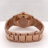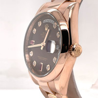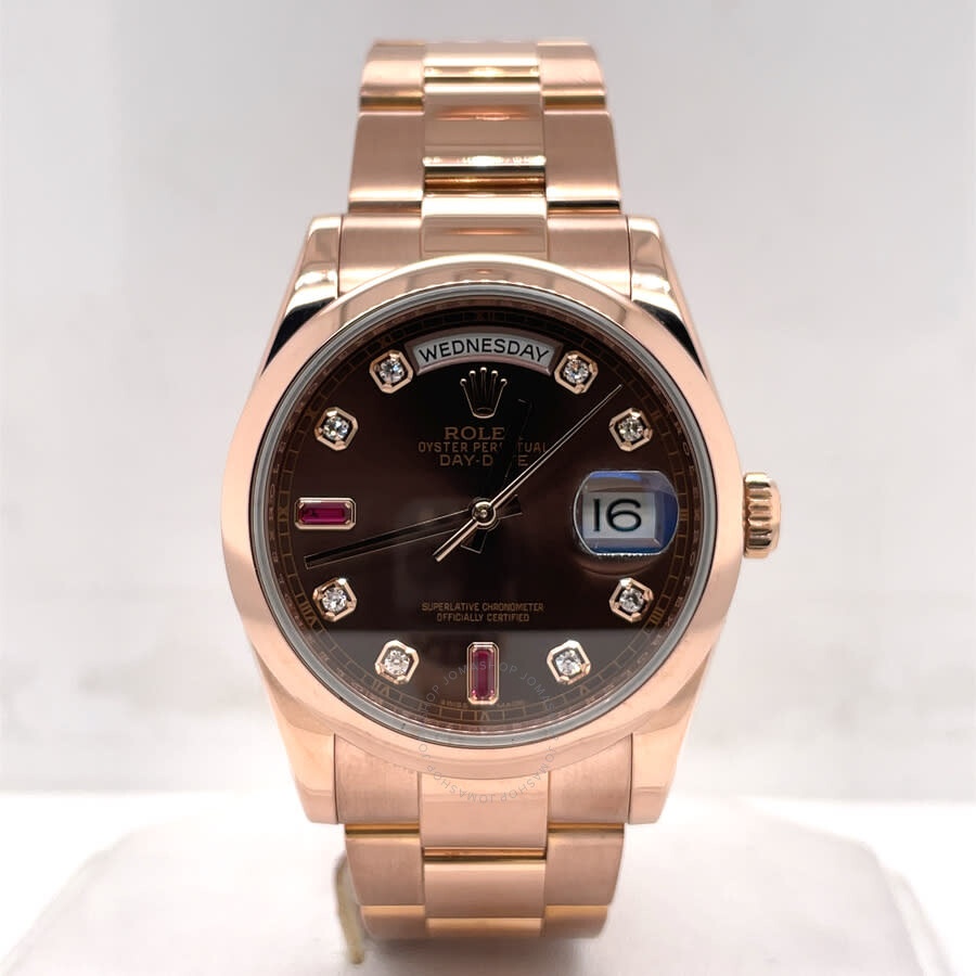 Rose gold-tone 18ct everose gold case with a rose gold-tone 18ct everose gold president bracelet. Fixed rose gold-tone 18ct everose gold bezel. Chocolate dial with rose gold-tone hands and diamond hour markers. Minute markers around the outer rim. Dial Type: Analog. Luminescent hands and markers. Date display at the 3 o'clock position. Rolex Calibre 3155 Automatic movement, based upon Rolex 3055, containing 31 Jewels, bitting at 28800 vph, and has a power reserve of approximately 48 hours. Scratch resistant sapphire crystal. Screw down crown. Solid case back. Round case shape, case size: 36 mm, case thickness: 13 mm. Band width: 18 mm. Crown clasp. Water resistant at 100 meters / 330 feet. Functions: day, date, hour, minute, second. Day Date Series. Luxury watch style. Watch label: Swiss Made. Pre-owned Rolex Day Date Automatic Diamond Men's Watch 118205 CHSRP. GENERAL Collection Name: Day-Date INFORMATION Brand: Rolex Series: Day-Date Model: 118205 CHSRP Gender: Mens Watch Label: Swiss Made Movement: Automatic Engine: Rolex Calibre 3155 CONDITION INFORMATION Box: Yes Preowned Item Condition: Excellent Papers: Yes Year: 2014 CASE Case Size: 36 mm Case Thickness: 13 mm Case Material: 18ct Everose Gold Case Shape: Round Case Back: Solid DIAL Type: Analog Dial Color: Chocolate Crystal: Scratch Resistant Sapphire Hands: Rose Gold-tone Second Markers: Minute Markers around the outer rim Dial Markers: Diamond Luminiscence: Hands and Markers Bezel: Fixed Bezel Color: Rose Gold-tone Bezel Material: 18ct Everose Gold Crown: Screw Down BAND Band Type: Bracelet Band Material: 18ct Everose Gold President Band Color: Rose Gold-tone Band Width: 18 mm Clasp: Crownclasp FEATURES Water Resistance: 100 meters / 330 feet Calendar: Date display at the 3 o'clock position Functions: Day, Date, Hour, Minute, Second Watch Features: Diamond, Gold, Analog ADDITIONAL INFO Watch Style: Luxury Warranty: 1 Year Jomashop Warranty Jomashop Sku: PRE-P-RLX54129 Department: Watches Category: Watches