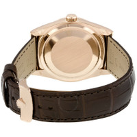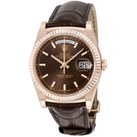 Pre-owned 18kt everose gold case with a brown leather strap. Fixed fluted 18kt everose gold bezel. Chocolate dial with luminous rose gold hands and index hour markers. Minute markers around the outer rim. Dial Type: Analog. Luminescent hands and markers. Date display at the 3 o'clock position. day of the week display centered on the 12 o'clock position. Rolex Calibre 3155 Automatic movement, based upon Rolex 3055, containing 31 Jewels, bitting at 28800 vph, and has a power reserve of approximately 48 hours. Scratch resistant sapphire crystal. Screw down crown. Solid case back. Round case shape, case size: 36 mm. Flip lock clasp. Water resistant at 100 meters / 330 feet. Functions: date, day, hour, minute, second, chronometer. Day-date Series. Luxury watch style. Watch label: Swiss Made. Item Variations: 118135-STRAP. Rolex Day-Date President Chocolate Dial 18kt Everose Gold Automatic Men's Watch 118135CHSL. GENERAL Collection Name: Day-Date INFORMATION Brand: Rolex Series: Day-Date Model: 118135CHSL Gender: Mens Watch Label: Swiss Made Movement: Automatic Engine: Rolex Calibre 3155 Power Reserve: 48 hours CONDITION INFORMATION Box: No Preowned Item Condition: Excellent Papers: No CASE Case Material: 18kt Everose Gold Case Shape: Round Case Back: Solid DIAL Type: Analog Dial Color: Chocolate Crystal: Scratch Resistant Sapphire Hands: Luminous Rose Gold Second Markers: Minute Markers around the outer rim Dial Markers: Index Luminiscence: Hands and Markers Bezel: Fixed Fluted Bezel Material: 18kt Everose Gold Crown: Screw Down BAND Band Type: Strap Band Material: Leather Band Color: Brown Clasp: Flip Lock FEATURES Water Resistance: 100 meters / 330 feet Calendar: Date display at the 3 o'clock position. Day of the week display centered on the 12 o'clock position Functions: Date, Day, Hour, Minute, Second, Chronometer Watch Features: Analog, Chronometer, Gold, Leather ADDITIONAL INFO Watch Style: Luxury Warranty: 1 Year Jomashop Warranty UPC Code: 845960076142 Jomashop Sku: PRE-P-RLX99360 Department: Watches