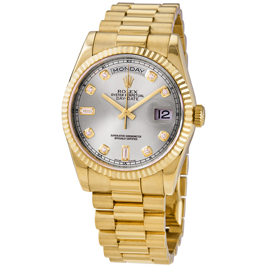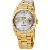 Pre-owned 18kt yellow gold case with a 18kt yellow gold rolex president bracelet. Fixed fluted 18kt yellow gold bezel. Silver dial with yellow gold-tone hands and diamond hour markers. Minute markers around the outer rim. Dial Type: Analog. Date display at 3 o'clock; day display at 12 o'clock.. Rolex Calibre 3155 automatic movement with a 48-hour power reserve. Scratch resistant sapphire crystal. Screw down crown. Solid case back. Round case shape. Case size: 36 mm. Concealed crown clasp. Water resistant at 100 meters / 330 feet. Functions: date, day, hour, minute, second, chronometer. Luxury watch style. Watch label: Swiss Made. Rolex Day-Date Silver Dial 18K Yellow Gold President Automatic Men's Watch 118238SDP. GENERAL Preowned Item Condition: Excellent CASE Case Material: 18kt Yellow Gold Case Shape: Round Case Back: Solid BAND Band Material: 18kt Yellow Gold Rolex President Band Type: Bracelet Band Color: Yellow Gold-tone Clasp: Concealed Crown DIAL Dial Color: Silver Type: Analog Crystal: Scratch Resistant Sapphire Hands: Yellow Gold-Tone Dial Markers: Diamond Second Markers: Minute Markers around the outer rim Bezel: Fixed fluted Bezel Color: Yellow Gold-tone Bezel Material: 18kt Yellow Gold Crown: Screw Down INFORMATION Brand: Rolex Series: Day-Date Collection Name: Day-Date Gender: Mens Model: 118238SDP Watch Label: Swiss Made Movement: Automatic Engine: Rolex Calibre 3155 Power Reserve: 48 hours FEATURES Water Resistance: 100 meters / 330 feet Calendar: Date display at 3 o'clock; Day Display at 12 o'clock. Functions: Date, Day, Hour, Minute, Second, Chronometer Watch Features: Analog, Chronometer, Gold, Diamond ADDITIONAL INFO Watch Style: Luxury Warranty: 1 Year Jomashop Warranty UPC Code: 845960076494 Jomashop Sku: PRE-P-RLX102315 Department: Watches Category: Watches