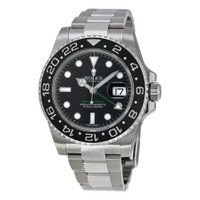 Pre-owned Silver-tone stainless steel case with a silver-tone stainless steel oyster bracelet. Bi-directional rotating black ceramic top ring stainless steel bezel. Black dial with luminous Mercedes-logo, sword, and Breguet-style shape hands and luminous dot hour markers. Minute markers around the outer rim. Dial Type: Analog. Luminescent hand and dial markers. Date display at the 3 o'clock position. Rolex Calibre 3186 automatic movement with a 50-hour power reserve. Scratch resistant sapphire crystal. Screw down crown. Solid case back. Round case shape, case size: 40 mm, case thickness: 12 mm. Band width: 19.5 mm. Deployment clasp. Water resistant at 100 meters / 330 feet. Functions: GMT, second time zone, date, hour, minute, second, chronometer. Additional Info: GMT timekeeping; green center hand indicates second time zone. Sport watch style. Watch label: Swiss Made. Item Variations: 116710LN, 116710-BKSO, Rolex-116710, Rolex-116710-BKSO. Rolex GMT Master II Black Index Dial Oyster Bracelet Steel Men's Watch 116710LN. GENERAL Preowned Item Condition: Mint CASE Case Thickness: 12 mm Case Material: Stainless Steel Case Shape: Round Case Back: Solid BAND Band Material: Stainless Steel Oyster Band Type: Bracelet Band Color: Silver-tone Band Width: 19.5 mm Clasp: Deployment DIAL Dial Color: Black Type: Analog Crystal: Scratch Resistant Sapphire Hands: Luminous Mercedes-logo, sword, and Breguet-style shape Dial Markers: Luminous Dot Second Markers: Minute Markers around the outer rim Luminiscence: Hand and Dial Markers Bezel: Bi-directional Rotating Bezel Color: Black Ceramic Top Ring Bezel Material: Stainless Steel Crown: Screw Down INFORMATION Brand: Rolex Series: Gmt Master Ii Collection Name: Gmt-Master Ii Gender: Mens Model: 116710LN-0001 Watch Label: Swiss Made Movement: Automatic Engine: Rolex Calibre 3186 Power Reserve: 50 hours FEATURES Water Resistance: 100 meters / 330 feet Calendar: Date display at the 3 o'clock position Functions: GMT, Second Time Zone, Date, Hour, Minute, Second, Chronometer Watch Features: Analog, GMT, Chronometer, Ceramic, Stainless Steel, Time Zone ADDITIONAL INFO Watch Style: Sport Warranty: 1 Year Jomashop Warranty UPC Code: 610074028635 Additional Info: GMT Timekeeping; Green Center Hand Indicates Second Time Zone Jomashop Sku: PRE-P-RLX101811 Department: Watches Category: Watches