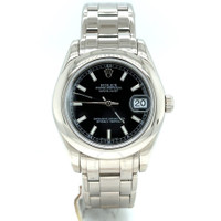 18kt white gold case with a 18kt white gold pearlmaster bracelet. Fixed 18kt white gold bezel. Black dial with silver-tone hands and index hour markers. Minute markers around the outer rim. Dial Type: Analog. Luminescent hands and markers. Date display at the 3 o'clock position. Rolex Calibre 2235 Automatic movement, containing 31 Jewels, bitting at 28800 vph, and has a power reserve of approximately 48 hours. Scratch resistant sapphire crystal. Screw down crown. Solid case back. Round case shape, case size: 34 mm, case thickness: 11 mm. Band width: 20 mm. Crown clasp. Water resistant at 100 meters / 330 feet. Functions: date, hour, minute, second. Lady Datejust Series. Luxury watch style. Watch label: Swiss Made. Pre-owned Rolex Lady Datejust Automatic Black Dial Ladies Watch 81209 BKSPM. GENERAL Collection Name: Lady Datejust INFORMATION Brand: Rolex Series: Lady Datejust Model: 81209 BKSPM Gender: Womens Watch Label: Swiss Made Movement: Automatic Engine: Rolex Calibre 2235 Power Reserve: 48 hours CONDITION INFORMATION Box: No Preowned Item Condition: Excellent Papers: No CASE Case Size: 34 mm Case Thickness: 11 mm Case Material: 18kt White Gold Case Shape: Round Case Back: Solid DIAL Type: Analog Dial Color: Black Crystal: Scratch Resistant Sapphire Hands: Silver-tone Second Markers: Minute Markers around the outer rim Dial Markers: Index Luminiscence: Hands and Markers Bezel: Fixed Bezel Material: 18kt White Gold Crown: Screw Down BAND Band Type: Bracelet Band Material: 18kt White Gold Pearlmaster Band Width: 20 mm Clasp: Crownclasp FEATURES Water Resistance: 100 meters / 330 feet Calendar: Date display at the 3 o'clock position Functions: Date, Hour, Minute, Second Watch Features: Gold, Analog ADDITIONAL INFO Watch Style: Luxury Warranty: 1 Year Jomashop Warranty Jomashop Sku: PRE-P-RLX66888 Department: Watches Category: Watches