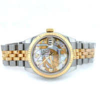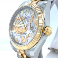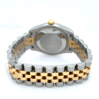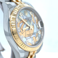 Silver-tone stainless steel case with a two-tone (silver-tone and yellow gold-tone) 18kt yellow gold and stainless steel jubilee bracelet. Fixed yellow gold-tone 18kt yellow gold bezel. Mother of pearl dial with yellow gold-tone hands and diamond hour markers. Dial Type: Analog. Date display at the 3 o'clock position. Rolex Calibre 2235 Automatic movement, containing 31 Jewels, bitting at 28800 vph, and has a power reserve of approximately 48 hours. Scratch resistant sapphire crystal. Screw down crown. Solid case back. Round case shape, case size: 31 mm, case thickness: 11 mm. Band width: 15 mm. Fold over clasp. Water resistant at 100 meters / 330 feet. Functions: date, hour, minute, second. Lady Datejust Series. Luxury watch style. Watch label: Swiss Made. Pre-owned Rolex Lady Datejust Automatic Diamond Ladies Watch 178273 MDJ. GENERAL Collection Name: Lady Datejust INFORMATION Brand: Rolex Series: Lady Datejust Model: 178273 MDJ Gender: Womens Watch Label: Swiss Made Movement: Automatic Engine: Rolex Calibre 2235 Power Reserve: 48 hours CONDITION INFORMATION Box: No Preowned Item Condition: Excellent Papers: Yes CASE Case Size: 31 mm Case Thickness: 11 mm Case Material: Stainless Steel Case Shape: Round Case Back: Solid DIAL Type: Analog Dial Color: Mother of Pearl Crystal: Scratch Resistant Sapphire Hands: Yellow Gold-tone Dial Markers: Diamond Bezel: Fixed Bezel Color: Yellow Gold-tone Bezel Material: 18kt Yellow Gold Crown: Screw Down BAND Band Type: Bracelet Band Material: 18kt Yellow Gold and Stainless Steel Jubilee Band Color: Two-tone (Silver-tone and Yellow Gold-tone) Band Width: 15 mm Clasp: Fold Over FEATURES Water Resistance: 100 meters / 330 feet Calendar: Date Display at the 3 o'clock position Functions: Date, Hour, Minute, Second Watch Features: Diamond, Stainless Steel, Gold, Analog ADDITIONAL INFO Watch Style: Luxury Warranty: 1 Year Jomashop Warranty Jomashop Sku: PRE-P-RLX63810 Department: Watches Category: Watches