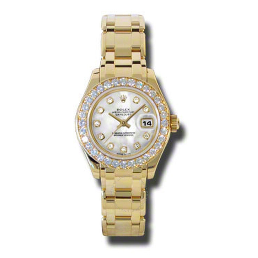 Pre-owned 18kt yellow gold case with a 18kt yellow gold rolex pearlmaster bracelet. Fixed 18kt yellow gold diamond set bezel. White mother-of-pearl dial with yellow gold-tone hands and diamond hour markers. Dial Type: Analog. Date display at the 3 o'clock position. Rolex Calibre 2235 Automatic movement, containing 31 Jewels, bitting at 28800 vph, and has a power reserve of approximately 48 hours. Scratch resistant synthetic sapphire crystal. Screw down crown. Solid case back. Round case shape. Case size: 29 mm. Concealed crown clasp. Water resistant at 100 meters / 330 feet. Functions: date, hour, minute, second, chronometer. Luxury watch style. Watch label: Swiss Made. Item Variations: 80318MDDP, Rolex-80318C. Rolex Lady-Datejust Pearlmaster White Mother-Of-Pearl Diamond Dial 18K Yellow Gold Automatic Ladies Watch 80298MDPM. GENERAL Collection Name: Lady-Datejust Pearlmaster INFORMATION Brand: Rolex Series: Lady-Datejust Pearlmaster Model: 80298MDDP Gender: Womens Watch Label: Swiss Made Movement: Automatic Engine: Rolex Calibre 2235 Power Reserve: 48 hours CONDITION INFORMATION Box: No Preowned Item Condition: Excellent Papers: Yes Year: 2006 CASE Case Size: 29 mm Case Material: 18kt Yellow Gold Case Shape: Round Case Back: Solid DIAL Type: Analog Dial Color: White Mother-of-pearl Crystal: Synthetic Sapphire Hands: Yellow Gold-Tone Dial Markers: Diamond Bezel: Fixed Bezel Color: 18kt Yellow Gold Bezel Material: Diamond Set Crown: Screw Down BAND Band Type: Bracelet Band Material: 18kt Yellow Gold Rolex Pearlmaster Clasp: Concealed Crown FEATURES Water Resistance: 100 meters / 330 feet Calendar: Date display at the 3 o'clock position Functions: Date, Hour, Minute, Second, Chronometer Watch Features: Diamond, Gold, Chronometer, Analog ADDITIONAL INFO Watch Style: Luxury Warranty: 1 Year Jomashop Warranty UPC Code: 845960082143 Jomashop Sku: PRE-P-RLX72309 Department: Watches Category: Watches