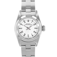 Silver-tone stainless steel case with a silver-tone stainless steel oyster bracelet. Fixed silver-tone stainless steel bezel. White dial with silver-tone hands and Roman numeral hour markers. Minute markers around the outer rim. Dial Type: Analog. Luminescent hands. Rolex Calibre 2130 Automatic movement, containing 29 Jewels, bitting at 28800 vph, and has a power reserve of approximately 42 hours. Screw down crown. Solid case back. Round case shape, case size: 24 mm. Fold over clasp with a safety release. Functions: hour, minute, second, chronometer. Oyster Perpetual 26 Series. Luxury watch style. Watch label: Swiss Made. Pre-owned Rolex Oyster Perpetual 26 Automatic Chronometer White Dial Ladies Watch 67180 WRO. GENERAL Year: Circa 1993 Comments: This Rolex Oyster Perpetual 26, reference number 67180, has a manufacturer year of Circa 1993. Box not included, Papers not included . This watch has a 24mm Steel Case with Steel bezel, White Roman numerals dial and Steel bracelet with Fold clasp. The Automatic movement has Time Only function. The wrist measures 6.75 inches or 17.145 centimeters. The condition is Very Good The watch listed is in stock and the pictures shown are of the actual watch for sale. All of our watches have been thorough Preowned Item Condition: Very Good CASE Case Material: Stainless Steel Case Shape: Round Case Back: Solid BAND Band Material: Stainless Steel Oyster Band Type: Bracelet Band Color: Silver-tone Clasp: Fold Over with Safety Release DIAL Dial Color: White Type: Analog Hands: Silver-tone Dial Markers: Roman Numeral Second Markers: Minute Markers around the outer rim Luminiscence: Hands Bezel: Fixed Bezel Color: Silver-tone Bezel Material: Stainless Steel Crown: Screw Down INFORMATION Brand: Rolex Series: Oyster Perpetual 26 Collection Name: Oyster Perpetual 26 Gender: Womens Model: 67180 WRO Watch Label: Swiss Made Movement: Automatic Engine: Rolex Calibre 2130 Power Reserve: 42 hours FEATURES Functions: Hour, Minute, Second, Chronometer Watch Features: Stainless Steel, Perpetual, Analog, Chronometer ADDITIONAL INFO Watch Style: Luxury Warranty: 1 Year Jomashop Warranty Jomashop Sku: PRE-P-RLX104217 Department: Watches Category: Watches