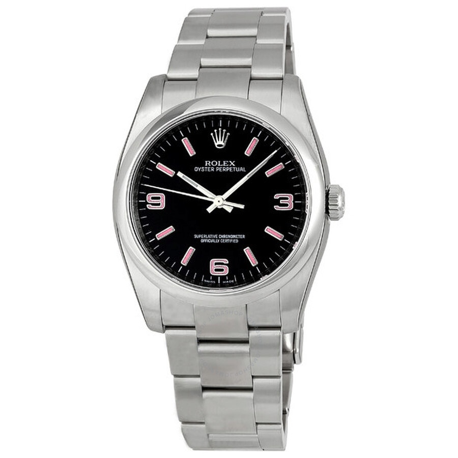 Pre-owned Stainless steel case with a stainless steel Rolex oyster bracelet. Fixed domed stainless steel bezel. Black dial with silver-tone hands and pink index hour markers. Arabic numerals mark the 3, 6 and 9 o'clock positions. The Rolex logo appears at the 12 o'clock position. Dial Type: Analog. Luminescent hands and dial markers. Rolex calibre 3130 automatic movement with a 48-hour power reserve. Scratch resistant sapphire crystal. Screw down crown. Solid case back. Case size: 36 mm. Round case shape. Oysterlock clasp. Water resistant at 100 meters / 330 feet. Functions: hour, minute, second. Luxury watch style. Watch label: Swiss Made. Item Variations: 116000. Rolex Oyster Perpetual 36 mm Black Dial Stainless Steel Rolex Oyster Automatic Men's Watch 116000BKAPSO. GENERAL Collection Name: Oyster Perpetual INFORMATION Brand: Rolex Series: Oyster Perpetual Model: 116000BKAPSO Gender: Mens Watch Label: Swiss Made Movement: Automatic Engine: Rolex Calibre 3130 Power Reserve: 48 hours CONDITION INFORMATION Box: No Preowned Item Condition: Excellent Papers: Yes CASE Case Size: 36 mm Case Material: Stainless Steel Case Shape: Round Case Back: Solid DIAL Type: Analog Dial Color: Black Crystal: Scratch Resistant Sapphire Hands: Silver-tone Second Markers: Arabic Numerals mark the 3, 6 and 9 o'clock po. The Rolex logo appears at the 12 o'clock position Dial Markers: Pink Index Luminiscence: Hands and Dial Markers Bezel: Fixed Domed Bezel Color: Silver-tone Bezel Material: Stainless Steel Polished Crown: Screw Down BAND Band Type: Bracelet Band Material: Stainless Steel Rolex Oyster Band Color: Silver-tone Clasp: Oysterlock FEATURES Water Resistance: 100 meters / 330 feet Functions: Hour, Minute, Second, Chronometer Watch Features: Stainless Steel, Perpetual, Chronometer, Analog ADDITIONAL INFO Watch Style: Luxury Warranty: 1 Year Jomashop Warranty UPC Code: 845960002745 Jomashop Sku: PRE-P-RLX64500 Department: Watches Category: Watches