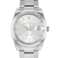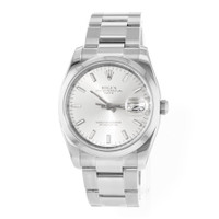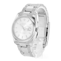 Silver-tone stainless steel case with a silver-tone stainless steel oyster bracelet. Fixed silver-tone stainless steel bezel. Silver-tone dial with silver-tone hands and index hour markers. Minute markers around the outer rim. Dial Type: Analog. Luminescent hands and markers. Date display at the 3 o'clock position. Rolex Calibre 3135 Automatic movement, containing 31 Jewels, bitting at 28800 vph, and has a power reserve of approximately 48 hours. Scratch resistant sapphire crystal. Screw down crown. Solid case back. Round case shape, case size: 34 mm. Fold over clasp with a safety release. Water resistant at 100 meters / 330 feet. Functions: date, hour, minute, second, chronometer. Oyster Perpetual Date Series. Luxury watch style. Watch label: Swiss Made. Item Variations: 115200, 115200-SSO, Rolex-115200, Rolex-115200-SSO. Pre-owned Rolex Oyster Perpetual Date Automatic Chronometer Silver Dial Men's Watch 115200 SSO. GENERAL Year: 2010 Comments: This Rolex Oyster Perpetual Date, reference number 115200, has a manufacturer year of 2010. Box not included, Papers Included . This watch has a 34mm Steel Case with Steel bezel, Silver Index numerals dial and Steel bracelet with Fold clasp. The Automatic movement has Date function. The wrist measures 7 inches or 17.78 centimeters. The condition is Very Good The watch listed is in stock and the pictures shown are of the actual watch for sale. All of our watches have been thoroughly checked by o Preowned Item Condition: Very Good CASE Case Material: Stainless Steel Case Shape: Round Case Back: Solid BAND Band Material: Stainless Steel Oyster Band Type: Bracelet Band Color: Silver-tone Clasp: Fold Over with Safety Release DIAL Dial Color: Silver-tone Type: Analog Crystal: Scratch Resistant Sapphire Hands: Silver-tone Dial Markers: Index Second Markers: Minute Markers around the outer rim Luminiscence: Hands and Markers Bezel: Fixed Bezel Color: Silver-tone Bezel Material: Stainless Steel Crown: Screw Down INFORMATION Brand: Rolex Series: Oyster Perpetual Collection Name: Oyster Perpetual Date Gender: Mens Model: 115200 SSO Watch Label: Swiss Made Movement: Automatic Engine: Rolex Calibre 3135 Power Reserve: 48 hours FEATURES Water Resistance: 100 meters / 330 feet Calendar: Date display at the 3 o'clock position Functions: Date, Hour, Minute, Second, Chronometer Watch Features: Analog, Chronometer, Perpetual, Stainless Steel ADDITIONAL INFO Watch Style: Luxury Warranty: 1 Year Jomashop Warranty Jomashop Sku: PRE-P-RLX103494 Item Variation: 115200, 115200-SSO, Rolex-115200, Rolex-115200-SSO Department: Watches Category: Watches