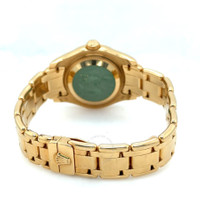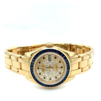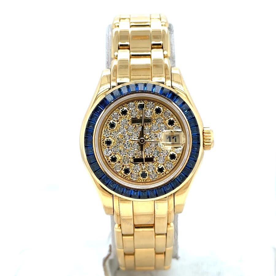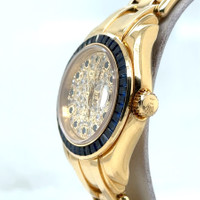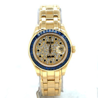 Yellow gold-tone 18kt yellow gold case with a yellow gold-tone 18kt yellow gold pearlmaster bracelet. Fixed blue sapphire set 18kt yellow gold bezel. Diamond dial with yellow gold-tone hands and diamond hour markers. Dial Type: Analog. Date display at the 3 o'clock position. Automatic movement. Scratch resistant sapphire crystal. Screw down crown. Solid case back. Round case shape, case size: 29 mm, case thickness: 10 mm. Band width: 14 mm. Crown clasp. Water resistant at 100 meters / 330 feet. Functions: date, hour, minute, second. Pearlmaster Series. Luxury watch style. Watch label: Swiss Made. Pre-owned Rolex Pearlmaster Automatic Diamond Ladies Watch 69308. GENERAL Collection Name: Pearlmaster INFORMATION Brand: Rolex Series: Pearlmaster Model: 69308 Gender: Womens Watch Label: Swiss Made Movement: Automatic CONDITION INFORMATION Box: No Preowned Item Condition: Excellent Papers: No CASE Case Size: 29 mm Case Thickness: 10 mm Case Material: 18kt Yellow Gold Case Shape: Round Case Back: Solid DIAL Type: Analog Dial Color: Diamond Crystal: Scratch Resistant Sapphire Hands: Yellow Gold-tone Dial Markers: Diamond Bezel: Fixed Bezel Color: Blue Bezel Material: Sapphire Set 18kt Yellow Gold Crown: Screw Down BAND Band Type: Bracelet Band Material: 18kt Yellow Gold Pearlmaster Band Color: Yellow Gold-tone Band Width: 14 mm Clasp: Crownclasp FEATURES Water Resistance: 100 meters / 330 feet Calendar: Date display at the 3 o'clock position Functions: Date, Hour, Minute, Second Watch Features: Diamond, Gold, Analog ADDITIONAL INFO Watch Style: Luxury Warranty: 1 Year Jomashop Warranty Jomashop Sku: PRE-P-RLX70491 Department: Watches Category: Watches