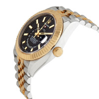 Pre-owned Stainless steel case with a stainless steel Rolex jubilee bracelet with 18kt yellow gold center links . Fluted ring command 18kt yellow gold bezel. Black dial with luminous yellow gold-tone hands and index hour markers. Minute markers around the outer rim. Dial Type: Analog. Luminescent hands and markers. Date display at the 3 o'clock position. 24 hour sub-dial. Rolex calibre 9001 automatic movement, containing 40 Jewels, composed of 380 parts, bitting at 28800 vph, and has a power reserve of approximately 72 hours. Scratch resistant sapphire crystal. Screw down crown. Solid case back. Round case shape. Case size: 42 mm. Oysterlock clasp. Water resistant at 100 meters / 330 feet. Functions: annual calendar, month, date, GMT, second time zone, hour, minute, second, chronometer. Oyster Perpetual Sky-dweller Series. Luxury watch style. Watch label: Swiss Made. Rolex Oyster Perpetual Sky-Dweller Automatic Chronometer Black Dial Men's Watch 326933BKSJ. GENERAL Preowned Item Condition: Excellent CASE Case Material: Stainless Steel Case Shape: Round Case Back: Solid BAND Band Material: Stainless Steel with 18kt Yellow Gold Rolex Jubile Band Type: Bracelet Clasp: Oysterlock DIAL Dial Color: Black Type: Analog Crystal: Scratch Resistant Sapphire Hands: Luminous Yellow Gold-tone Dial Markers: Index Second Markers: Minute Markers around the outer rim Sub Dials: One - 24 Hour Luminiscence: Hands and Markers Bezel: Bi-directional Rotating Ring Command Bezel Material: 18kt Yellow Gold Crown: Screw Down INFORMATION Brand: Rolex Series: Sky-Dweller Collection Name: Sky Dweller Gender: Mens Model: 326933BKSJ Watch Label: Swiss Made Movement: Automatic Engine: Rolex Calibre 9001 Power Reserve: 72 hours FEATURES Water Resistance: 100 meters / 330 feet Calendar: Date display at the 3 o'clock position Functions: Annual Calendar, Month, Date, GMT, Second Time Zone, Hour, Minute, Second, Chronometer Watch Features: Analog, GMT, Annual Calendar, Chronometer, Month, Perpetual, Gold, Stainless Steel, Time Zone ADDITIONAL INFO Watch Style: Luxury Warranty: 1 Year Jomashop Warranty Jomashop Sku: PRE-P-RLX100755 Department: Watches Category: Watches