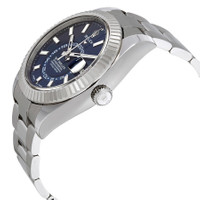 Pre-owned Stainless steel case with a stainless steel Rolex oyster bracelet with 18kt white gold links. Fluted ring command 18kt white gold bezel. Blue dial with luminous silver-tone hands and index hour markers. Minute markers around the outer rim. Dial Type: Analog. Luminescent hands and markers. Date display at the 3 o'clock position. 24 hour sub-dial. Rolex calibre 9001 automatic movement, containing 40 Jewels, composed of 380 parts, bitting at 28800 vph, and has a power reserve of approximately 72 hours. Scratch resistant sapphire crystal. Screw down crown. Solid case back. Round case shape. Case size: 42 mm. Oysterlock clasp. Water resistant at 100 meters / 330 feet. Functions: annual calendar, month, date, GMT, second time zone, hour, minute, second, chronometer. Sky-dweller Series. Luxury watch style. Watch label: Swiss Made. Rolex Sky-Dweller Oyster Automatic Blue Dial Men's Watch 326934BLSO. GENERAL Preowned Item Condition: Mint CASE Case Material: Stainless Steel Case Shape: Round Case Back: Solid BAND Band Material: Stainless Steel Rolex Oyster with 18kt White Gold Band Type: Bracelet Band Color: Silver-tone Clasp: Oysterlock DIAL Dial Color: Blue Type: Analog Crystal: Scratch Resistant Sapphire Hands: Luminous Silver-tone Dial Markers: Index Second Markers: Minute Markers around the outer rim Sub Dials: One - 24 Hour Luminiscence: Hands and Markers Bezel: Bi-directional Rotating Ring Command Bezel Material: 18kt White Gold Crown: Screw Down INFORMATION Brand: Rolex Series: Sky-Dweller Collection Name: Sky Dweller Gender: Mens Model: 326934BLSO Watch Label: Swiss Made Movement: Automatic Engine: Rolex Calibre 9001 Power Reserve: 72 hours FEATURES Water Resistance: 100 meters / 330 feet Calendar: Date display at the 3 o'clock position Functions: Annual Calendar, Month, Date, GMT, Second Time Zone, Hour, Minute, Second, Chronometer Watch Features: Analog, GMT, Annual Calendar, Chronometer, Month, Gold, Stainless Steel, Time Zone ADDITIONAL INFO Watch Style: Luxury Warranty: 1 Year Jomashop Warranty UPC Code: 842047140253 Jomashop Sku: PRE-P-RLX100713 Department: Watches Category: Watches
