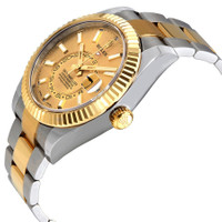 Pre-owned Stainless steel case with a stainless steel Rolex oyster bracelet with 18kt yellow gold center links. Fluted 18kt yellow gold bezel. Champagne dial with luminous yellow gold-tone hands and index hour markers. Minute markers around the outer rim. Dial Type: Analog. Date display at the 3 o'clock position. 24 hours sub-dial. Rolex calibre 9001 automatic movement with a 72-hour power reserve. Scratch resistant sapphire crystal. Screw down crown. Solid case back. Round case shape. Case size: 42 mm. Oysterlock clasp. Water resistant at 100 meters / 330 feet. Functions: GMT, second time zone, hour, minute, second. Luxury watch style. Watch label: Swiss Made. Rolex Oyster Perpetual Sky-Dweller Champagne Dial Automatic Men's Watch 326933CSO. GENERAL Year: 2022 Preowned Item Condition: Mint CASE Case Material: Stainless Steel Case Shape: Round Case Back: Solid BAND Band Material: Stainless Steel and 18kt Yellow Gold Rolex Oyster Band Type: Bracelet Band Color: Silver-tone Clasp: Oysterlock DIAL Dial Color: Champagne Type: Analog Crystal: Scratch Resistant Sapphire Hands: Luminous Yellow Gold-tone Dial Markers: Index Second Markers: Minute Markers around the outer rim Sub Dials: One - 24 Hour Bezel: Bi-directional Rotating Ring Command Bezel Color: Yellow Gold-tone Bezel Material: 18kt Yellow Gold Crown: Screw Down INFORMATION Brand: Rolex Series: Sky-Dweller Collection Name: Sky-Dweller Gender: Mens Model: 326933CSO Watch Label: Swiss Made Movement: Automatic Engine: Rolex Calibre 9001 Power Reserve: 72 hours FEATURES Water Resistance: 100 meters / 330 feet Calendar: Date display at the 3 o'clock position Functions: Annual Calendar, Month, Date, GMT, Second Time Zone, Hour, Minute, Second, Chronometer Watch Features: Analog, GMT, Annual Calendar, Chronometer, Month, Perpetual, Gold, Stainless Steel, Time Zone ADDITIONAL INFO Watch Style: Luxury Warranty: 1 Year Jomashop Warranty UPC Code: 842047125083 Jomashop Sku: PRE-P-RLX103614 Department: Watches Category: Watches