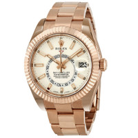 Pre-owned 18kt everrose gold case with a 18kt everrose gold Rolex oyster bracelet. Fluted ring command 18kt everrose gold bezel. White dial with luminous rose gold-tone hands and index hour markers. Minute markers around the outer rim. Dial Type: Analog. Date display at the 3 o'clock position. 24 hour subdials. Rolex calibre 9001 automatic movement with a 72-hour power reserve. Scratch resistant sapphire crystal. Screw down crown. Solid case back. Round case shape. Case size: 42 mm. Oysterlock clasp. Water resistant at 100 meters / 330 feet. Functions: annual calendar, month, date, GMT, second time zone, hour, minute, second, chronometer. Luxury watch style. Watch label: Swiss Made. Rolex Sky-Dweller White Dial Automatic Men's 18kt Everrose Gold Oyster Watch 326935WSO. GENERAL Preowned Item Condition: Excellent CASE Case Material: 18kt Everrose Gold Case Shape: Round Case Back: Solid BAND Band Material: 18kt Everrose Gold Rolex Oyster Band Type: Bracelet Clasp: Oysterlock DIAL Dial Color: White Type: Analog Crystal: Scratch Resistant Sapphire Hands: Luminous Rose Gold-tone Dial Markers: Index Second Markers: Minute Markers around the outer rim Sub Dials: One - 24 Hour Bezel: Bi-directional Rotating Ring Command Bezel Material: 18kt Everrose Gold Crown: Screw Down INFORMATION Brand: Rolex Series: Sky-Dweller Collection Name: Sky Dweller Gender: Mens Model: 326935WSO Watch Label: Swiss Made Movement: Automatic Engine: Rolex Calibre 9001 Power Reserve: 72 hours FEATURES Water Resistance: 100 meters / 330 feet Calendar: Date display at the 3 o'clock position Functions: Annual Calendar, Month, Date, GMT, Second Time Zone, Hour, Minute, Second, Chronometer Watch Features: Analog, GMT, Annual Calendar, Chronometer, Month, Gold, Time Zone ADDITIONAL INFO Watch Style: Luxury Warranty: 1 Year Jomashop Warranty UPC Code: 842047137963 Jomashop Sku: PRE-P-RLX100635 Department: Watches Category: Watches