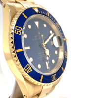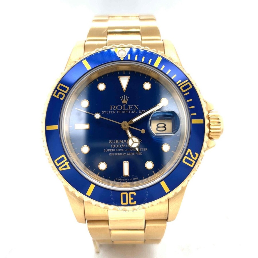 Yellow gold-tone 18kt yellow gold case with a yellow gold-tone 18kt yellow gold rolex oyster bracelet. Uni-directional rotating 18kt yellow gold with an inlaid blue ceramic ring bezel. Blue dial with luminous yellow gold-tone Mercedes-logo, sword, and Breguet-style hands and dot hour markers. Minute markers around the outer rim. Dial Type: Analog. Luminescent hands and dial markers. Date display at the 3 o'clock position. Rolex Calibre 3135 Automatic movement, containing 31 Jewels, bitting at 28800 vph, and has a power reserve of approximately 48 hours. Scratch resistant sapphire crystal. Screw down crown. Solid case back. Round case shape, case size: 40 mm, case thickness: 14 mm. Oysterlock clasp. Water resistant at 300 meters / 1000 feet. Functions: date, hour, minute, second, chronometer. Submariner Series. Dive watch style. Watch label: Swiss Made. Pre-owned Rolex Submariner Automatic Chronometer Blue Dial Men's Watch 16618 LB. GENERAL Collection Name: Submariner INFORMATION Brand: Rolex Series: Submariner Model: 16618 LB Gender: Mens Watch Label: Swiss Made Movement: Automatic Engine: Rolex Calibre 3135 Power Reserve: 50 hours CONDITION INFORMATION Box: No Preowned Item Condition: Excellent Papers: No CASE Case Size: 40 mm Case Thickness: 14 mm Case Material: 18kt Yellow Gold Case Shape: Round Case Back: Solid DIAL Type: Analog Dial Color: Blue Crystal: Scratch Resistant Sapphire Hands: Luminous Yellow Gold-tone Mercedes-logo, sword, and Breguet-style Second Markers: Minute Markers around the outer rim Dial Markers: Dot Luminiscence: Hands and Dial Markers Bezel: Uni-directional Rotating Bezel Material: 18kt Yellow Gold with an inlaid Blue Ceramic Ring Crown: Screw Down BAND Band Type: Bracelet Band Material: 18kt Yellow Gold Rolex Oyster Band Color: Yellow Gold-tone Clasp: Oysterlock FEATURES Water Resistance: 300 meters / 1000 feet Calendar: Date display at the 3 o'clock position Functions: Date, Hour, Minute, Second, Chronometer Watch Features: Gold, Ceramic, Chronometer, Analog ADDITIONAL INFO Watch Style: Dive Warranty: 1 Year Jomashop Warranty UPC Code: 845960064170 Jomashop Sku: PRE-P-RLX65427 Department: Watches Category: Watches