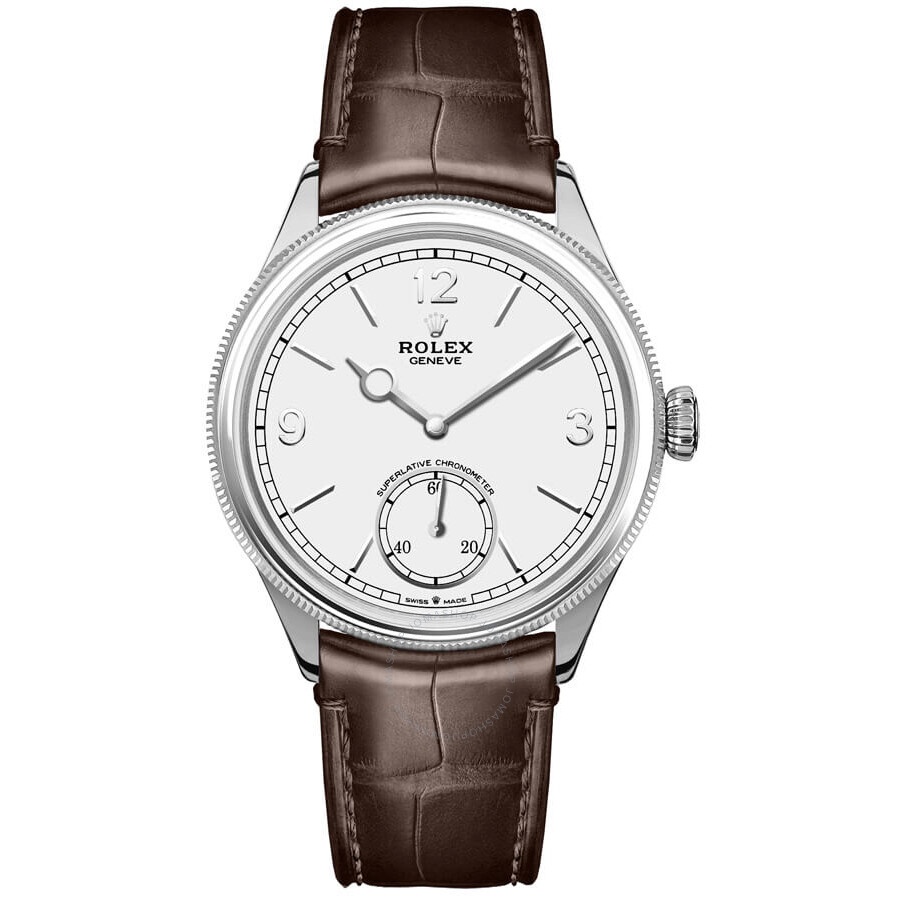 18kt white gold case with a brown alligator leather strap. Fluted 18kt white gold bezel. White dial with silver-tone hands and index-Arabic numeral hour markers. Minute markers around the outer rim. Dial Type: Analog. One subdial displaying: small second. Rolex Calibre 7140 automatic movement with a 66-hour power reserve. Scratch resistant sapphire crystal. Domed crown. Transparent case back. Round case shape, case size: 39 mm. Dual clasp. Water resistant at 50 meters / 165 feet. Functions: hour, minute, small second. 1908 Series. Luxury watch style. Watch label: Swiss Made. Item Variations: M52509-0006. Rolex 1908 Automatic White Dial Men's Watch 52509-0006. INFORMATION Brand: Rolex Series: 1908 Collection Name: 1908 Gender: Mens Model: 52509-0006 Watch Label: Swiss Made Movement: Automatic Engine: Rolex Calibre 7140 Power Reserve: 66 hours CASE Case Size: 39 mm Case Material: 18kt White Gold Case Shape: Round Case Back: Transparent BAND Band Material: Alligator Leather Band Type: Strap Band Color: Brown Clasp: Dualclasp DIAL Dial Color: White Type: Analog Crystal: Scratch Resistant Sapphire Hands: Silver-tone Dial Markers: Index-Arabic Numeral Second Markers: Minute Markers around the outer rim Sub Dials: One - Small Second Bezel: Fluted Bezel Material: 18kt White Gold Crown: Domed FEATURES Water Resistance: 50 meters / 165 feet Functions: Hour, Minute, Small Second Watch Features: Leather, Gold, Analog, Alligator Leather ADDITIONAL INFO Watch Style: Luxury Warranty: 2 Year Jomashop Warranty Jomashop Sku: RLX52509-0006 Item Variation: M52509-0006 Department: Watches Category: Watches