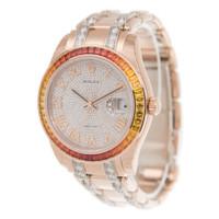 Rose gold-tone 18kt everose gold case with a rose gold-tone 18kt everose gold and 144 dimond set pearlmaster bracelet. Fixed 18kt everose gold 48 orange yo yellow gradient baguette-cut sapphires diamond set bezel. 18kt everose gold paved with 455 diamonds dial with rose gold-tone hands and Roman numeral hour markers. Dial Type: Analog. Date display at the 3 o'clock position. Rolex Calibre 3235 automatic movement with a 70-hour power reserve. Scratch resistant sapphire crystal. Screw down crown. Solid case back. Round case shape. Case size: 39 mm. Crown clasp. Water resistant at 100 meters / 330 feet. Functions: date, hour, minute, second, chronometer. Luxury watch style. Watch label: Swiss Made. Rolex Automatic Chronometer Diamond Watch 86345SAJOR. INFORMATION Brand: Rolex Series: Pearlmaster Collection Name: Pearlmaster Gender: Womens Model: 80285N Watch Label: Swiss Made Movement: Automatic Engine: Rolex Calibre 3235 Power Reserve: 70 hours CASE Case Size: 39 mm Case Color: Rose Gold-Tone Case Material: 18kt Everose Gold Case Shape: Round Case Back: Solid BAND Band Material: 18kt Everose Gold and 144 Dimond Set Pearlmaster Band Type: Bracelet Band Color: Rose Gold-tone Clasp: Crownclasp DIAL Dial Color: 18kt Everose Gold Paved with 455 diamonds Type: Analog Crystal: Scratch Resistant Sapphire Hands: Rose Gold-tone Dial Markers: Roman Numeral Bezel: Fixed Bezel Color: 18kt Everose Gold Bezel Material: 48 Orange yo Yellow Gradient Baguette-cut Sapphires Diamond Set Crown: Screw Down FEATURES Water Resistance: 100 meters / 330 feet Calendar: Date display at the 3 o'clock position Functions: Date, Hour, Minute, Second, Chronometer Watch Features: Diamond, Gold, Chronometer, Analog ADDITIONAL INFO Watch Style: Luxury Warranty: 2 Year Jomashop Warranty Jomashop Sku: RLX86345SAJOR Department: Watches Category: Watches