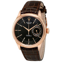 Rose gold-tone 18kt rose gold case with a brown tobacco leather strap. Fixed domed and fluted rose gold-tone 18kt rose gold bezel. Black guilloche dial with rose gold-tone arrow-shaped hands and index hour markers. Minute markers around an inner ring. Dial Type: Analog. Date display at the 3 o'clock position. One subdial displaying: date. Rolex Calibre 3165 Automatic movement, based upon Rolex 3130, containing 31 Jewels, bitting at 28800 vph, and has a power reserve of approximately 48 hours. Scratch resistant sapphire crystal. Screw down crown. Solid, screw down case back. Round case shape, case size: 39 mm. Pin buckle clasp. Water resistant at 50 meters / 165 feet. Functions: date, hour, minute, second, chronometer. Cellini Series. Casual watch style. Watch label: Swiss Made. Rolex Cellini Black Dial 18K Rose Gold Automatic Men's Watch 50515BKSBRL. CASE Case Size: 39 Case Color: Rose Gold-Tone Case Material: 18kt Rose Gold Case Shape: Round Case Back: Solid, Screw Down BAND Band Material: Tobacco Leather Band Type: Strap Band Color: Brown Clasp: Pin Buckle DIAL Dial Color: Black Guilloche Type: Analog Crystal: Scratch Resistant Sapphire Hands: Rose Gold-tone Arrow-shaped Dial Markers: Index Second Markers: Minute Markers around an inner ring Sub Dials: One - Date Bezel: Fixed Domed and Fluted Bezel Color: Rose Gold-tone Bezel Material: 18kt Rose Gold Crown: Screw Down INFORMATION Brand: Rolex Series: Cellini Collection Name: Cellini Gender: Mens Model: 50515BKSBRL Watch Label: Swiss Made Movement: Automatic Engine: Rolex Calibre 3165 Power Reserve: 48 hours FEATURES Water Resistance: 50 meters / 165 feet Calendar: Date display at the 3 o'clock position Functions: Date, Hour, Minute, Second, Chronometer Watch Features: Leather, Gold, Chronometer, Analog ADDITIONAL INFO Watch Style: Casual Warranty: 2 Year Jomashop Warranty UPC Code: 842047107539 Jomashop Sku: RLX50515BKSBRL Department: Watches Category: Watches