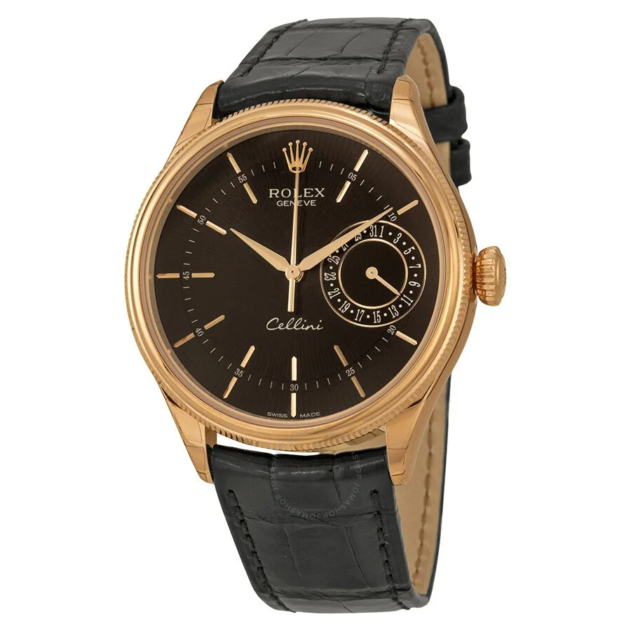 18kt everose gold case with a black (alligator) leather strap. Fixed domed and fluted 18kt everose gold bezel. Black dial with rose gold-tone hands and index hour markers. Arabic numeral minute markers (at 5 minute intervals). Minute markers around an inner ring. Dial Type: Analog. Date display at the 3 o'clock position. Date subdials. Rolex calibre 3165 automatic movement, based upon Rolex 3130, containing 31 Jewels, bitting at 28800 vph, and has a power reserve of approximately 48 hours. Scratch resistant sapphire crystal. Screw down crown. Solid case back. Round case shape. Case size: 39 mm. Tang clasp. Water resistant at 50 meters / 165 feet. Functions: date, hour, minute, second, chronometer. Cellini Series. Luxury watch style. Watch label: Swiss Made. Rolex Cellini Date Black Dial 18kt Everose Gold Men's Watch 50515BKSBKL. CASE Case Size: 39 Case Color: Rose Gold-Tone Case Material: 18kt Everose Gold Case Shape: Round Case Back: Solid BAND Band Material: (Alligator) Leather Band Type: Strap Band Color: Black Clasp: Tang DIAL Dial Color: Black Type: Analog Crystal: Scratch Resistant Sapphire Hands: Rose Gold-tone Dial Markers: Index Second Markers: Arabic Numeral Minute Markers (at 5 minute intervals). Minute Markers around an inner ring Sub Dials: Date Bezel: Fixed Domed and Fluted Bezel Color: Rose Gold-tone Bezel Material: 18kt Everose Gold Crown: Screw Down INFORMATION Brand: Rolex Series: Cellini Collection Name: Cellini Gender: Mens Model: 50515BKSBKL Watch Label: Swiss Made Movement: Automatic Engine: Rolex Calibre 3165 Power Reserve: 48 hours FEATURES Water Resistance: 50 meters / 165 feet Calendar: Date display at the 3 o'clock position Functions: Date, Hour, Minute, Second, Chronometer Watch Features: Leather, Gold, Chronometer, Analog, Alligator Leather ADDITIONAL INFO Watch Style: Luxury Warranty: 2 Year Jomashop Warranty UPC Code: 845960066334 Jomashop Sku: RLX50515BKSBKL Department: Watches Category: Watches