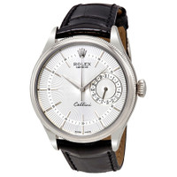 18kt white gold case with a black (alligator) leather strap. Fixed domed fluted 18kt white gold bezel. Silver dial with rose gold-tone arrow-shaped hands and index hour markers. Arabic numeral minute markers (at 5 minute intervals). Minute markers. Dial Type: Analog. Date display at the 3 o'clock position. Date sub-dial appears at the 3 o'clock position. Rolex calibre 3165 Automatic movement, based upon Rolex 3130, containing 31 Jewels, bitting at 28800 vph, and has a power reserve of approximately 48 hours. Scratch resistant sapphire crystal. Screw down crown. Solid case back. Round case shape. Case size: 39 mm. Oyster clasp. Water resistant at 50 meters / 165 feet. Functions: date, hour, minute, second, chronometer. Cellini Series. Luxury watch style. Watch label: Swiss Made. Item Variations: 50519-STRAP. Rolex Cellini Date Silver Dial 18K White Gold Men's Watch 50519SSBKL. CASE Case Size: 39 Case Material: 18kt White Gold Case Shape: Round Case Back: Solid BAND Band Material: (Alligator) Leather Band Type: Strap Band Color: Black Clasp: Oysterclasp DIAL Dial Color: Silver Type: Analog Crystal: Scratch Resistant Sapphire Hands: Rose Gold-tone Arrow-shaped Dial Markers: Index Second Markers: Minute Markers Sub Dials: Date Bezel: Fixed Domed Fluted Bezel Material: 18kt White Gold Crown: Screw Down INFORMATION Brand: Rolex Series: Cellini Collection Name: Cellini Gender: Mens Model: 50519SSBKL Watch Label: Swiss Made Movement: Automatic Engine: Rolex Calibre 3165 Power Reserve: 48 hours FEATURES Water Resistance: 50 meters / 165 feet Calendar: Date display at the 3 o'clock position Functions: Date, Hour, Minute, Second, Chronometer Watch Features: Leather, Gold, Chronometer, Analog, Alligator Leather ADDITIONAL INFO Watch Style: Luxury Warranty: 2 Year Jomashop Warranty UPC Code: 845960082099 Jomashop Sku: RLX50519SSBKL Item Variation: 50519-STRAP Department: Watches Category: Watches