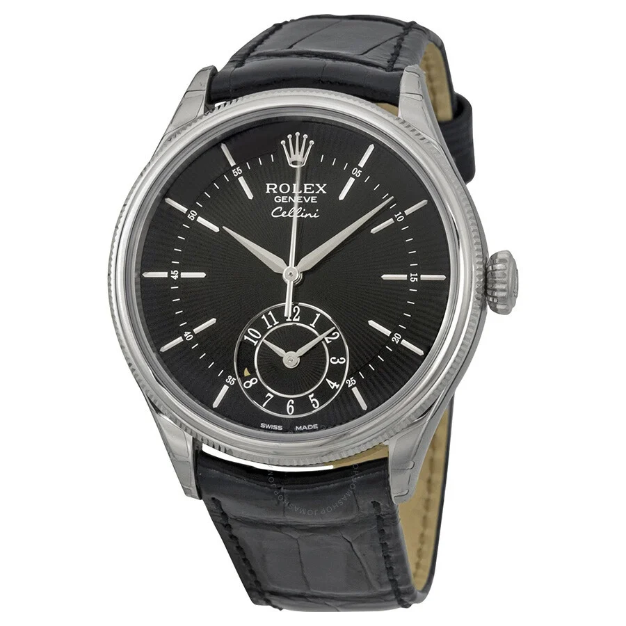 18kt white gold case with a black (alligator) leather strap. Fixed domed fluted 18kt white gold bezel. Black guilloche dial with white gold hands and index hour markers. Arabic numeral minute markersd (at 5 minute intervals). Minute markers. Dial Type: Analog. 12 hour (GMT) sub-dial at the 6 o'clock position. Rolex calibre 3180 automatic movement, based upon Rolex 3130, containing 31 Jewels, bitting at 28800 vph, and has a power reserve of approximately 48 hours. Scratch resistant sapphire crystal. Pull / push crown. Solid case back. Round case shape. Case size: 39 mm. Tang clasp. Water resistant at 50 meters / 165 feet. Functions: GMT, second time zone, hour, minute, second, day/night indicator, chronometer. Cellini Series. Luxury watch style. Watch label: Swiss Made. Rolex Cellini Dual Time Black Dial 18kt White Gold Men's Watch 50529BKSBKL. CASE Case Size: 39 Case Material: 18kt White Gold Case Shape: Round Case Back: Solid BAND Band Material: (Alligator) Leather Band Type: Strap Band Color: Black Clasp: Tang DIAL Dial Color: Black Guilloche Type: Analog Crystal: Scratch Resistant Sapphire Hands: White Gold Dial Markers: Index Second Markers: Minute Markers Sub Dials: 12 Hour (GMT) at the 6 o'clock position Bezel: Fixed Domed Fluted Bezel Material: 18kt White Gold Crown: Pull / Push INFORMATION Brand: Rolex Series: Cellini Collection Name: Cellini Gender: Mens Model: 50529BKSBKL Watch Label: Swiss Made Movement: Automatic Engine: Rolex Calibre 3180 Power Reserve: 48 hours FEATURES Water Resistance: 50 meters / 165 feet Functions: GMT, Second Time Zone, Hour, Minute, Second, Day/Night Indicator, Chronometer Watch Features: Alligator Leather, Analog, GMT, Day/Night Indicator, Chronometer, Gold, Leather, Time Zone ADDITIONAL INFO Watch Style: Luxury Warranty: 2 Year Jomashop Warranty UPC Code: 845960082105 Jomashop Sku: RLX50529BKSBKL Department: Watches Category: Watches