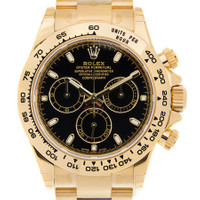 18kt yellow gold case with a 18kt yellow gold rolex oyster bracelet. Fixed yellow gold 18kt yellow gold bezel. Black dial with gold-tone hands and index hour markers. Tachymeter. Dial Type: Analog. Luminescent hands and markers. Chronograph - three sub-dials displaying: 60 second, 30 minute and 12 hours. Rolex Calibre 4130 automatic movement with a 72-hour power reserve. Scratch resistant sapphire crystal. Screw down crown. Solid case back. Case size: 40 mm. Round case shape. Water resistant at 100 meters / 330 feet. Functions: chronograph, hour, minute, second. Luxury watch style. Watch label: Swiss Made. Rolex Cosmograph Daytona Black Dial Automatic Men's Chronograph Watch 116508BKSO. CASE Case Size: 40 Case Material: 18kt Yellow Gold Case Shape: Round Case Back: Solid BAND Band Material: 18kt Yellow Gold Rolex Oyster Band Type: Bracelet DIAL Dial Color: Black Type: Analog Crystal: Scratch Resistant Sapphire Hands: Gold-tone Dial Markers: Index Second Markers: Tachymeter Sub Dials: Three - 60 Second, 30 Minute and 12 Hour Luminiscence: Hands and Markers Bezel: Fixed Tachymeter Scale Bezel Material: 18kt Yellow Gold Crown: Screw Down INFORMATION Brand: Rolex Series: Cosmograph Daytona Collection Name: Cosmograph Daytona Gender: Mens Model: 116508BKSO Watch Label: Swiss Made Movement: Automatic Engine: Rolex Calibre 4130 Power Reserve: 72 hours FEATURES Water Resistance: 100 meters / 330 feet Functions: Chronograph, Hour, Minute, Second Watch Features: Chronograph, Gold, Analog ADDITIONAL INFO Watch Style: Luxury Warranty: 2 Year Jomashop Warranty Jomashop Sku: RLX116508BKSO Item Variation: M116508-0004 Department: Watches Category: Watches
