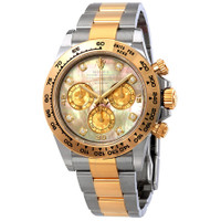 Stainless steel and 18kt yellow gold case with a two-tone (silver-tone and gold-tone) stainless steel and 18k yellow gold rolex oyster bracelet. Fixed tachymeter scale 18kt yellow gold bezel. Black mother of pearl dial with gold-tone hands and diamond hour markers. Minute markers around the outer rim. Dial Type: Analog. Luminescent hands. Chronograph - three sub-dials displaying: 60 second, 30 minute and 12 hours. Rolex Calibre 4130 automatic movement with a 72-hour power reserve. Scratch resistant sapphire crystal. Screw down crown. Solid case back. Round case shape. Case size: 40 mm. Oysterlock clasp. Water resistant at 100 meters / 330 feet. Functions: chronograph, hour, minute, small second, chronometer. Luxury watch style. Watch label: Swiss Made. Rolex Cosmograph Daytona Black Mother Of Pearl Diamond Dial Men's Watch 116503BKMDO. CASE Case Size: 40 Case Material: Stainless Steel and 18kt Yellow Gold Case Shape: Round Case Back: Solid BAND Band Material: Stainless Steel and 18K Yellow Gold Rolex Oyster Band Type: Bracelet Band Color: Two-tone (Silver-tone and Gold-tone) Clasp: Oysterlock DIAL Dial Color: Black Mother Of Pearl Type: Analog Crystal: Scratch Resistant Sapphire Hands: Gold-tone Dial Markers: Diamond Second Markers: Minute Markers around the outer rim Sub Dials: Three - 60 Second, 30 Minute and 12 Hour Luminiscence: Hands Bezel: Fixed Tachymeter Scale Bezel Material: 18kt Yellow Gold Crown: Screw Down INFORMATION Brand: Rolex Series: Cosmograph Daytona Collection Name: Cosmograph Daytona Gender: Mens Model: 116503BKMDO Watch Label: Swiss Made Movement: Automatic Engine: Rolex Calibre 4130 Power Reserve: 72 hours FEATURES Water Resistance: 100 meters / 330 feet Functions: Chronograph, Hour, Minute, Small Second, Chronometer Watch Features: Analog, Chronometer, Gold, Stainless Steel, Chronograph, Diamond ADDITIONAL INFO Watch Style: Luxury Warranty: 2 Year Jomashop Warranty UPC Code: 842047140161 Jomashop Sku: RLX116503BKMDO Department: Watches Category: Watches