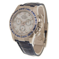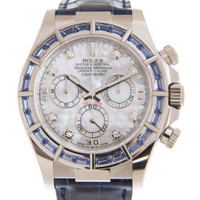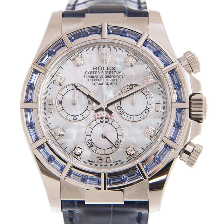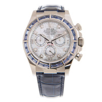 18kt white gold case with a blue leather strap. Fixed 18kt white gold bezel set with 24 baguette sodalite. Mother of pearl dial with luminous white gold hands and diamond hour markers. Arabic numerals appear at the 15, 30 and 45 minute positions. Minute markers around the outer rim. Dial Type: Analog. Chronograph - three sub-dials displaying: 60 second, 30 minute and 12 hour. Rolex calibre 4130 Automatic movement, based upon Rolex 4030, containing 44 Jewels, bitting at 28800 vph, and has a power reserve of approximately 72 hours. Scratch resistant sapphire crystal. Screw down crown. Solid case back. Round case shape. Case size: 40 mm. Fold over clasp with a safety release. Water resistant at 100 meters / 330 feet. Functions: chronograph, hour, minute, second, chronometer. Additional Info: original box, international warranty card, manual (complete accessories). Cosmograph Daytona Series. Casual watch style. Watch label: Swiss Made. Rolex Cosmograph Daytona Chronograph Automatic Chronometer Diamond Men's Watch 116589SACI. CASE Case Size: 40 Case Material: 18kt White Gold Case Shape: Round Case Back: Solid BAND Band Material: Leather Band Type: Strap Band Color: Blue Clasp: Fold Over with Safety Release DIAL Dial Color: Mother of Pearl Type: Analog Crystal: Scratch Resistant Sapphire Hands: Luminous White Gold Dial Markers: Diamond Second Markers: Arabic Numerals appear at the 15, 30 and 45 minute positions. Minute Markers around the outer rim Sub Dials: Three - 60 Second, 30 Minute and 12 Hour Bezel: Fixed Bezel Material: 18kt White Gold set with 24 Baguette Sodalite Crown: Screw Down INFORMATION Brand: Rolex Series: Cosmograph Daytona Collection Name: Cosmograph Daytona Gender: Mens Model: 116589SACI Watch Label: Swiss Made Movement: Automatic Engine: Rolex Calibre 4130 Power Reserve: 72 hours FEATURES Water Resistance: 100 Meters / 330 Feet Functions: Chronograph, Hour, Minute, Second, Chronometer Watch Features: Analog, Chronometer, Gold, Leather, Chronograph, Diamond ADDITIONAL INFO Watch Style: Casual Warranty: 2 Year Jomashop Warranty Additional Info: Original Box, Manual (Complete Accessories) Jomashop Sku: RLX116589SACI Department: Watches Category: Watches