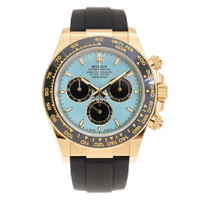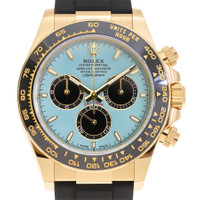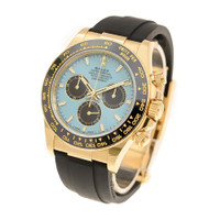 Yellow gold-tone 18kt yellow gold case with a black rubber strap. Fixed tachymeter scale black cerachrom bezel. Turquoise blue dial with yellow gold-tone hands and index hour markers. Minute markers around the outer rim. Dial Type: Analog. Luminescent hands and markers. Chronograph - three sub-dials displaying: 60 second, 30 minute and 12 hour. Rolex Calibre 4131 Automatic movement, based upon Rolex Calibre 4130, containing 47 Jewels, bitting at 28800 vph, and has a power reserve of approximately 72 hours. Scratch resistant sapphire crystal. Screw down crown. Solid case back. Round case shape, case size: 40 mm. Fold over clasp with a safety release. Water resistant at 100 meters / 330 feet. Functions: chronograph, hour, minute, small second, chronometer. Cosmograph Daytona Series. Luxury watch style. Watch label: Swiss Made. Rolex Cosmograph Daytona Chronograph Automatic Chronometer Men's Watch m126518ln-0014. GENERAL Box Type: Original Box CASE Case Diameter: 40 mm Case Material: 18kt Yellow Gold Case Shape: Round Case Back: Solid BAND Band Material: Rubber Band Type: Strap Band Color: Black Clasp: Fold Over with Safety Release DIAL Dial Color: Turquoise Blue Type: Analog Crystal: Scratch Resistant Sapphire Hands: Yellow Gold-tone Dial Markers: Index Second Markers: Minute Markers around the outer rim Sub Dials: Three - 60 Second, 30 Minute and 12 Hour Luminiscence: Hands and Markers Bezel: Fixed Tachymeter Scale Bezel Color: Black Bezel Material: Cerachrom Crown: Screw Down INFORMATION Brand: Rolex Series: Cosmograph Daytona Collection Name: Cosmograph Daytona Gender: Mens Model: m126518ln-0014 Watch Label: Swiss Made Movement: Automatic Engine: Rolex Calibre 4131 Power Reserve: 72 hours FEATURES Water Resistance: 100 meters / 330 feet Functions: Chronograph, Hour, Minute, Small Second, Chronometer Watch Features: Analog, Chronometer, Gold, Rubber, Chronograph ADDITIONAL INFO Watch Style: Luxury Warranty: 2 Year Jomashop Warranty Jomashop Sku: RLXM126518LN0014 Department: Watches